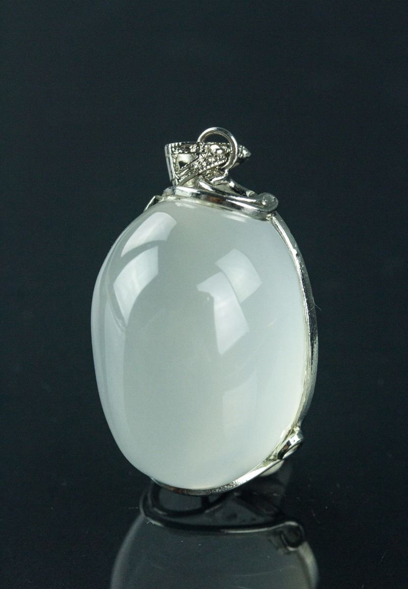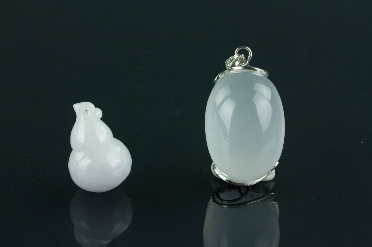Two pieces of white jade and hardstone pendant; comprised of one calabash jadeite pendant of lavender tone and one icy cabochon hardstone pendant; H: 3 cm, W: 2 cm, 28 grams both; Density of the jadeite pendant: 3.33