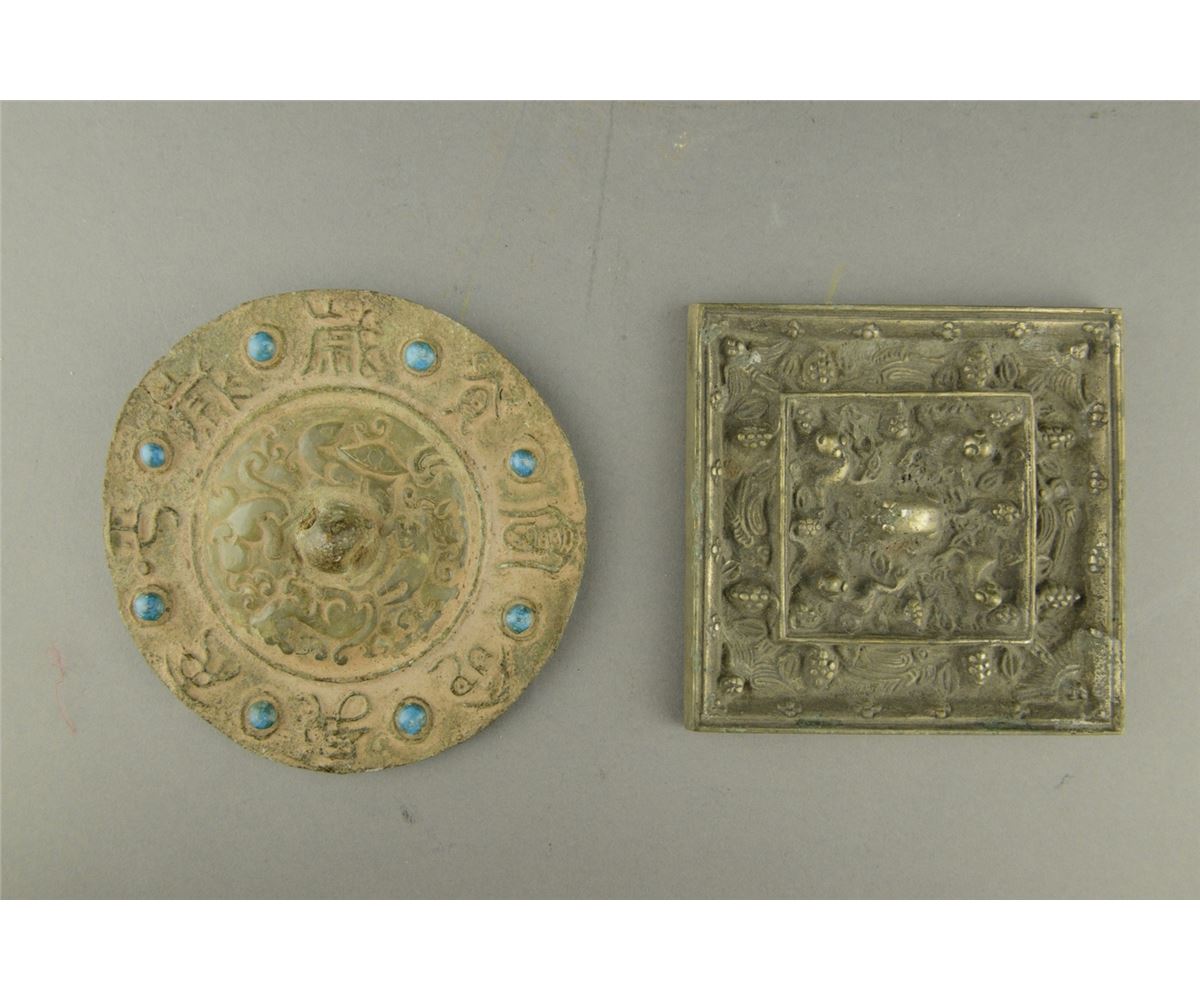 Ornate two pieces of Japanese bronze mirrors, first of circular shape cast Chinese scripts with turquoise stones; second of rectangular shape cast blossoms. D: 12 cm, total 980 grams. Provenance: T. Ng Collection Toronto.