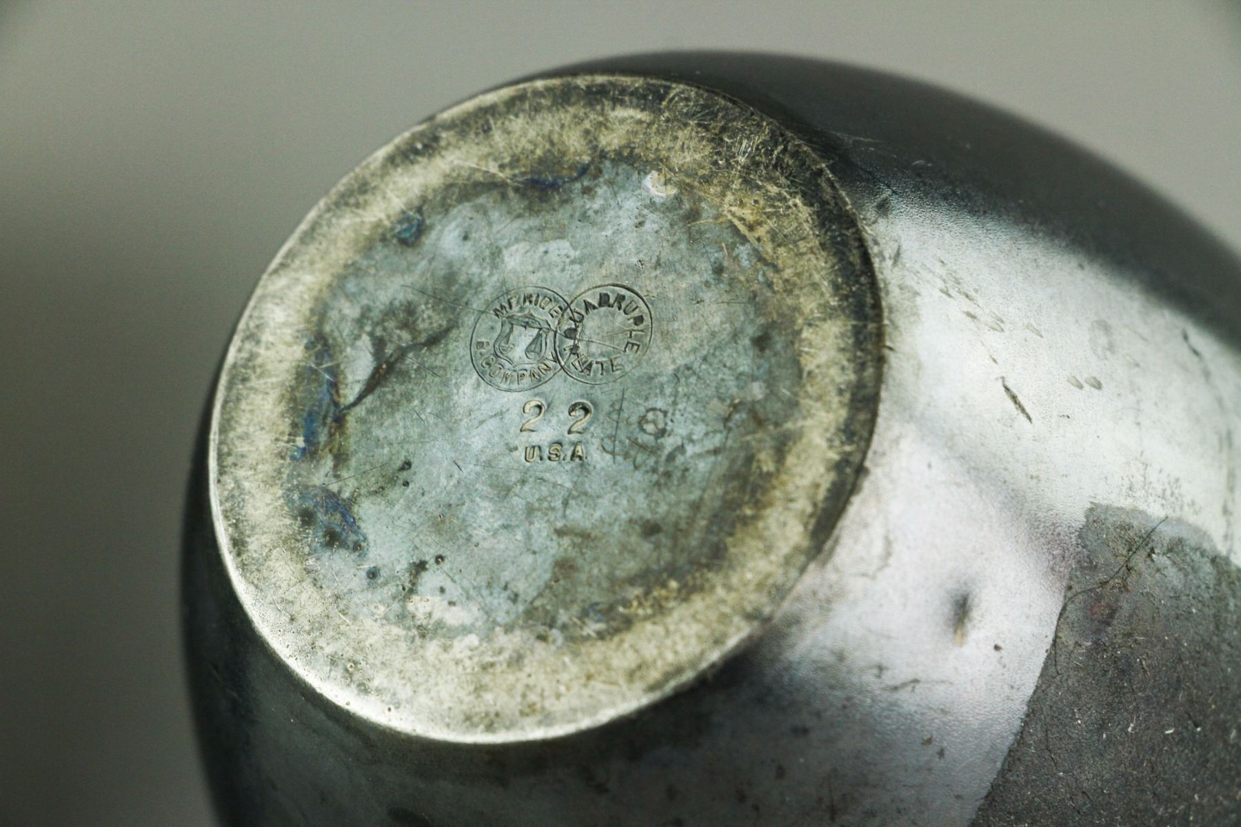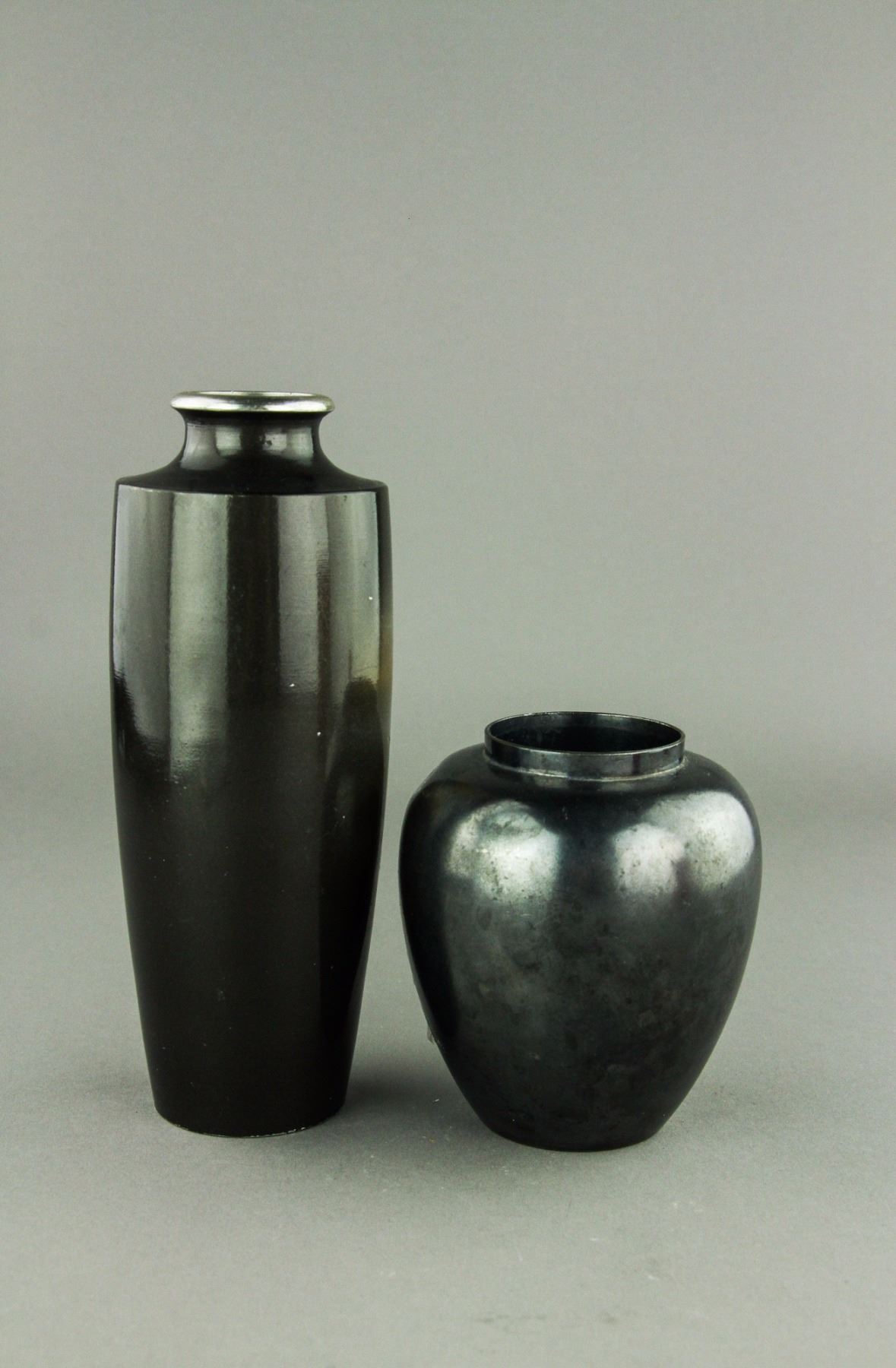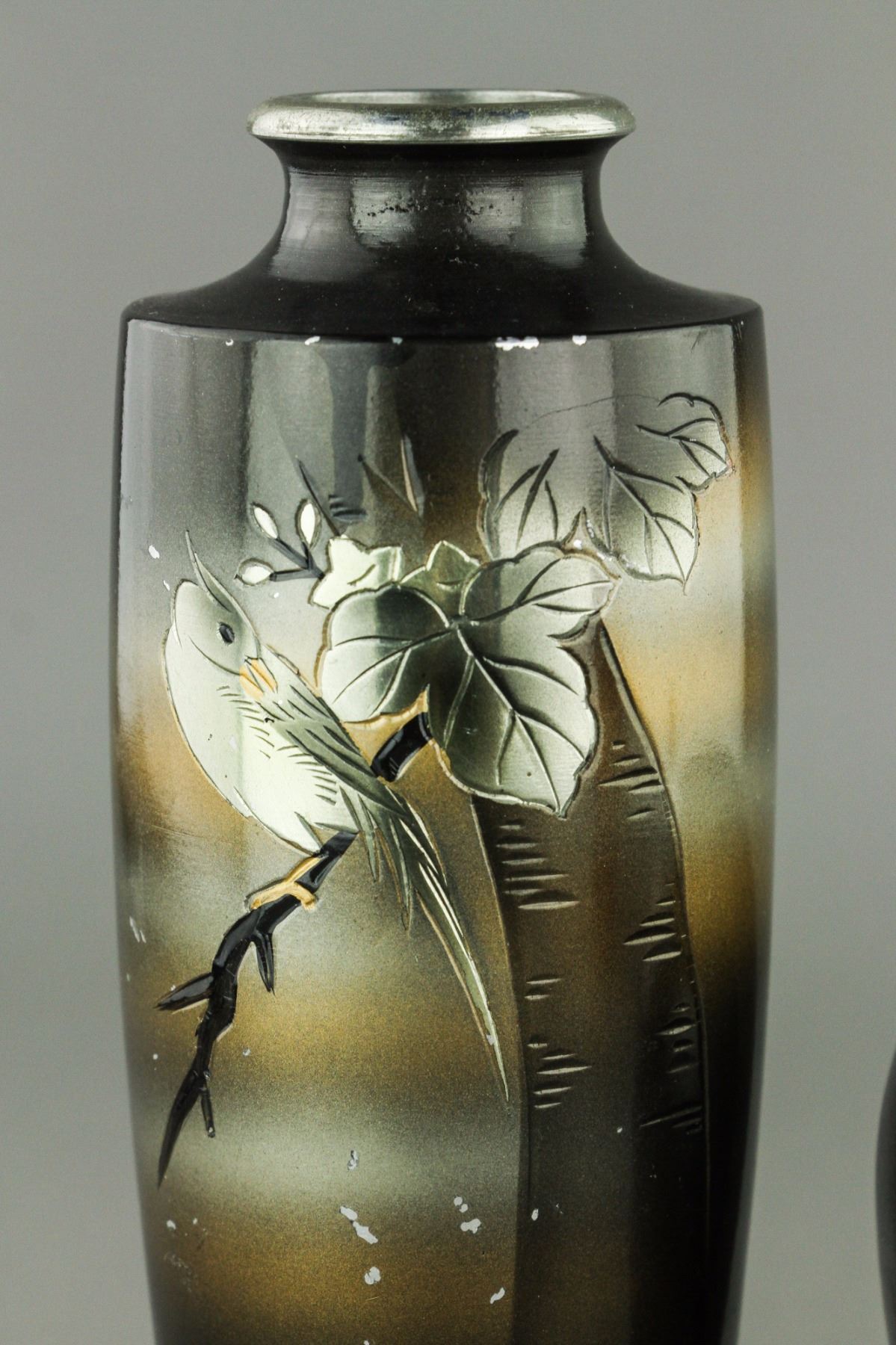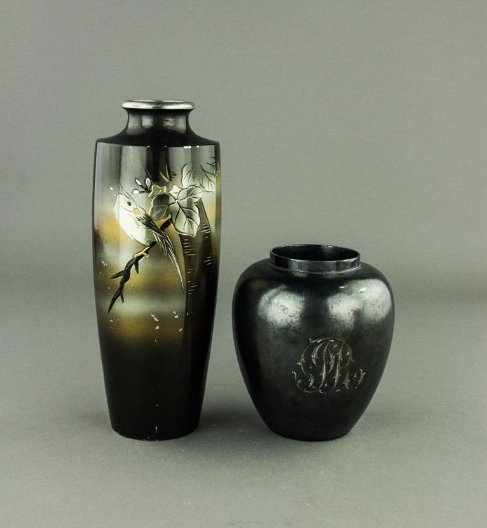 Two pieces of Japanese and American silvered vase and jar; the vase of cylindrical body with narrow opening and carved with birds perching on tree branch; the jar stamped with U.S.A. maker marks on base; H: 11/19 cm, D: 7/9 cm, 483 grams total