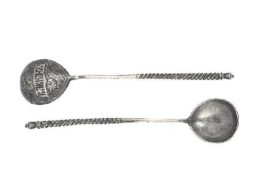 Silver, 28 g. Twisted terminal, engraved and niello decoration on the bowl. Marked: Moscow, 1877, Viktor Szabinkov, Fjodor Ivanov. Postnikova-Losseva, Platonova, Ulianova - L orfévrerie et la Bijouterie au XV-XX. ss. (Territoire de l URSS).: P. 2112, 2953. Length: 13 cm