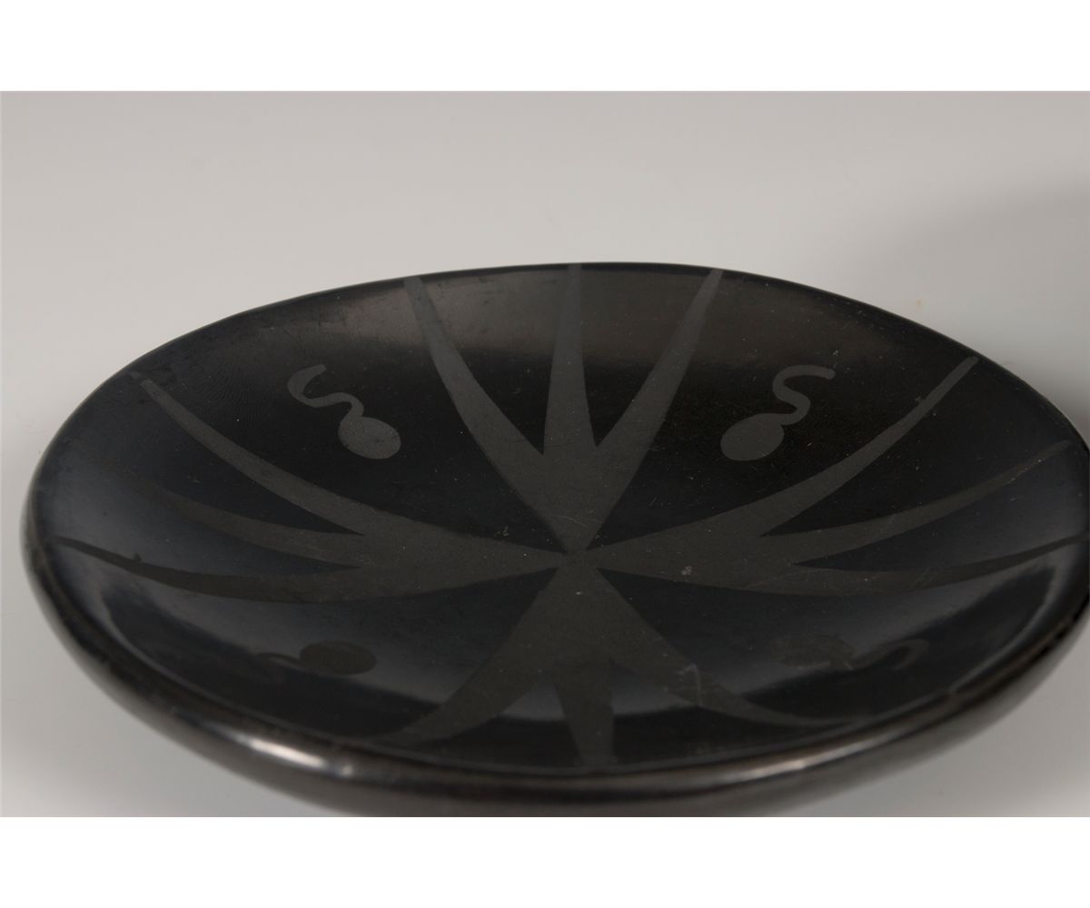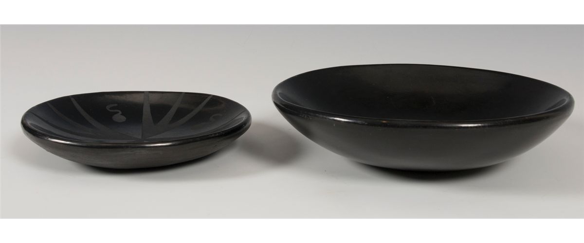 Two Pieces of San Ildefonso Pottery. #1 6" diameter plate by Maria Martinez (1887 - 1980) and Popovi Da (1922-1971) with black on black designs in a radiant pattern. Signed on base: Maria / Popovi. #2 7.5" x 2" bowl by Adam Martinez (1901 - 2000) and Santana Martinez (1909 - 2002). Signed on base: Santana / Adam.