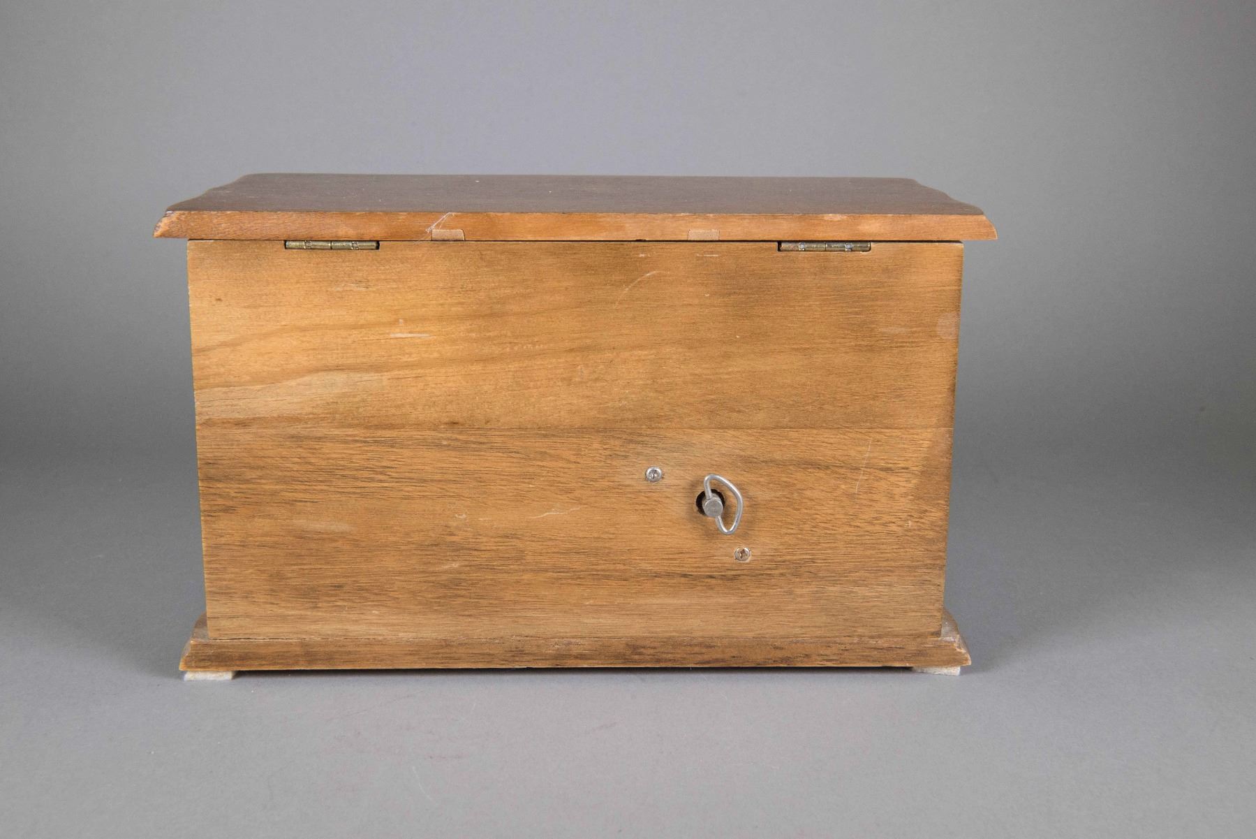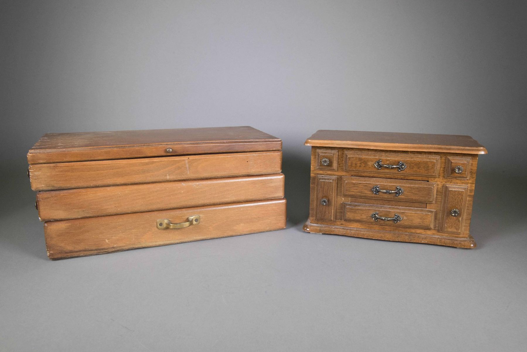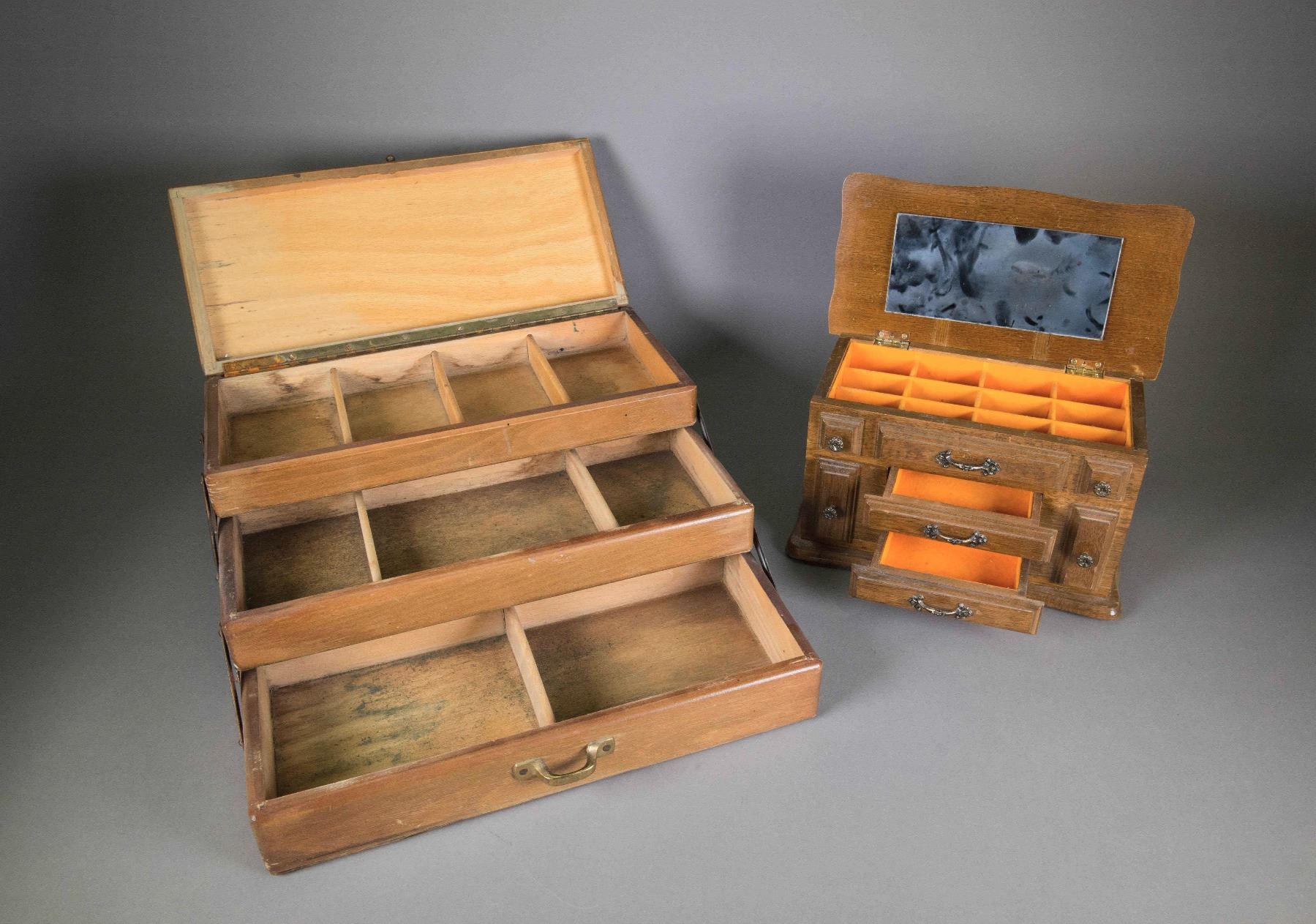 Two pieces of Chinese wood jewellery boxes; larger one featuring three layers with dividers; smaller one is musical featuring three tiers topped with grid compartments and a mirror cover; H: 15 cm, W: 23 cm, 3248 grams