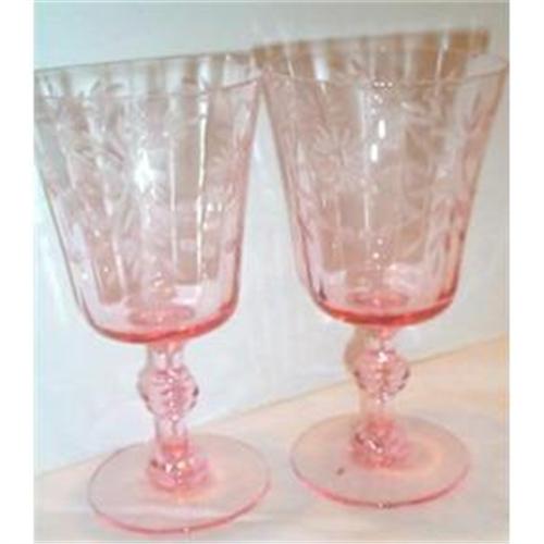 We are offering you two (2) lovely Pink Fry Elegant Depression Water Goblets. Each goblet is cut with a unique and lovely floral design. Each goblet is in SUPERIOR condition with no chips, cracks or dings and they each measure 3.25" in diameter and stand 6" tall.