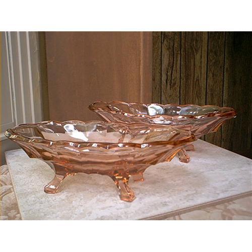 Pink Serving Dishes in glass. Mint or nut bowls. Measures 8.5 inches wide and 4 inches deep and 3 inches tall. These look like depression glass, not sure if new or old glass. They are very pretty.