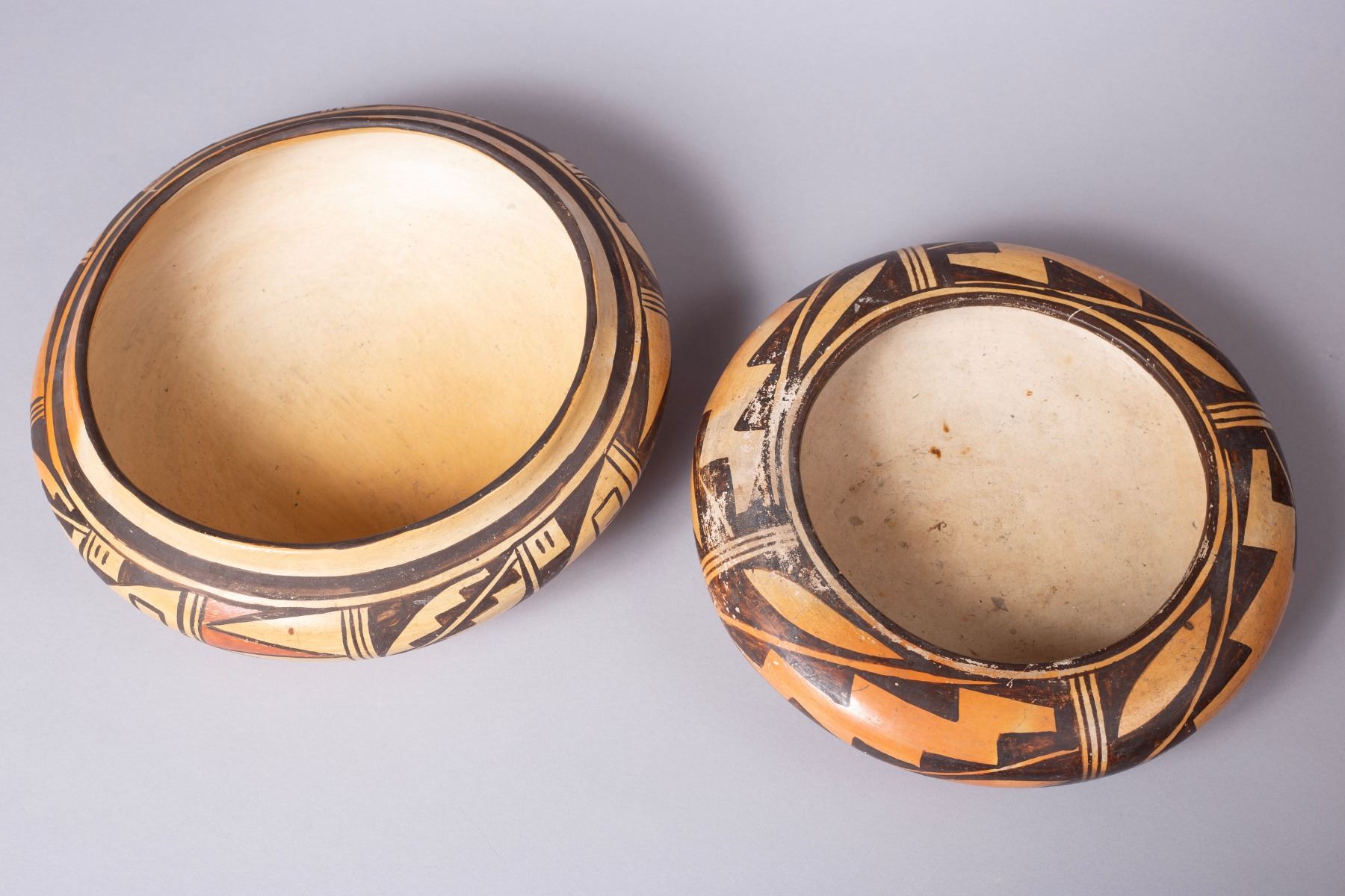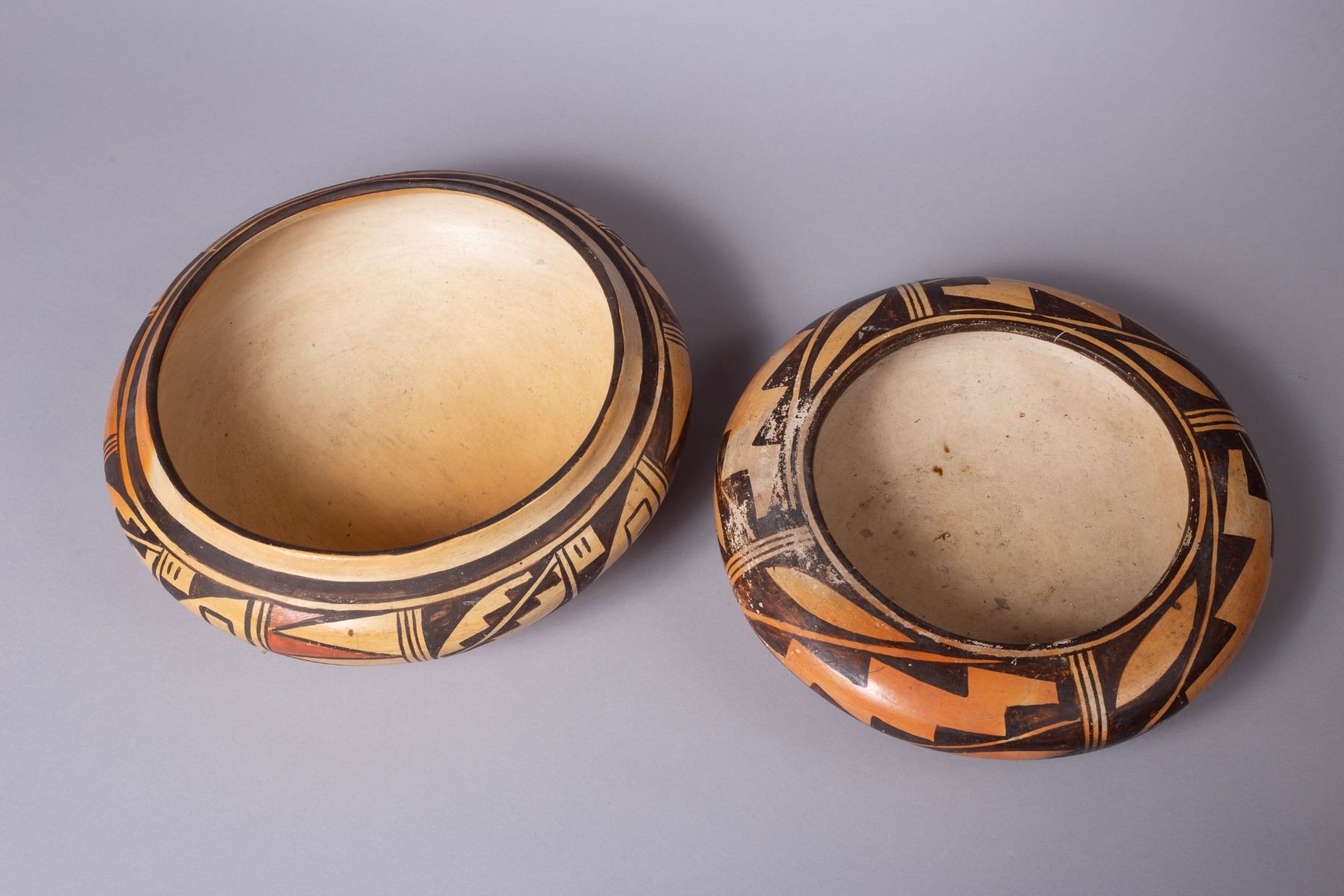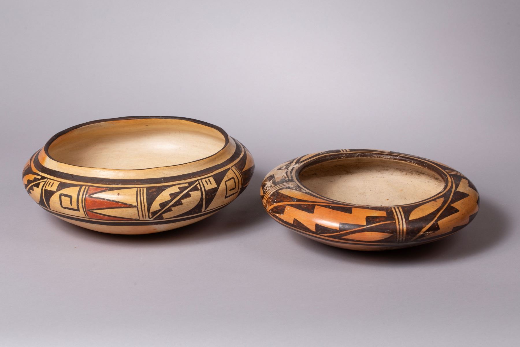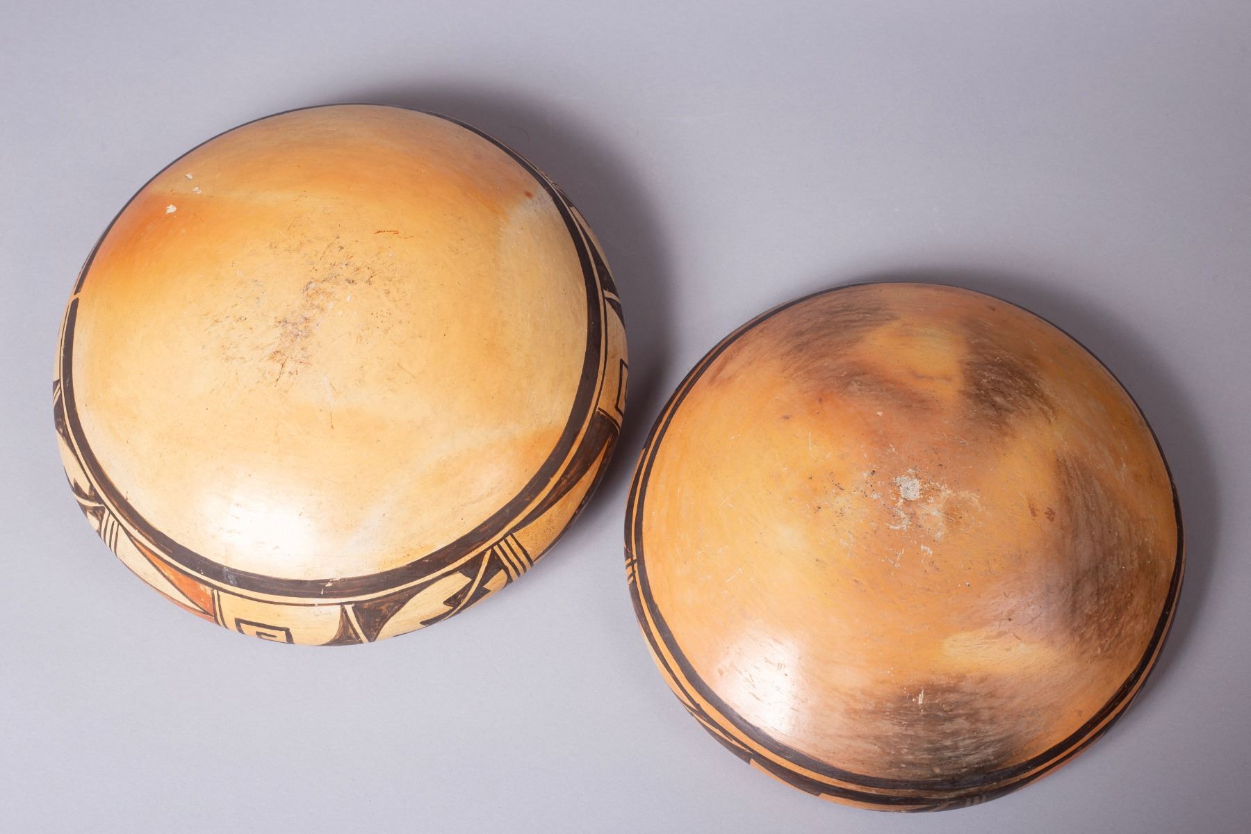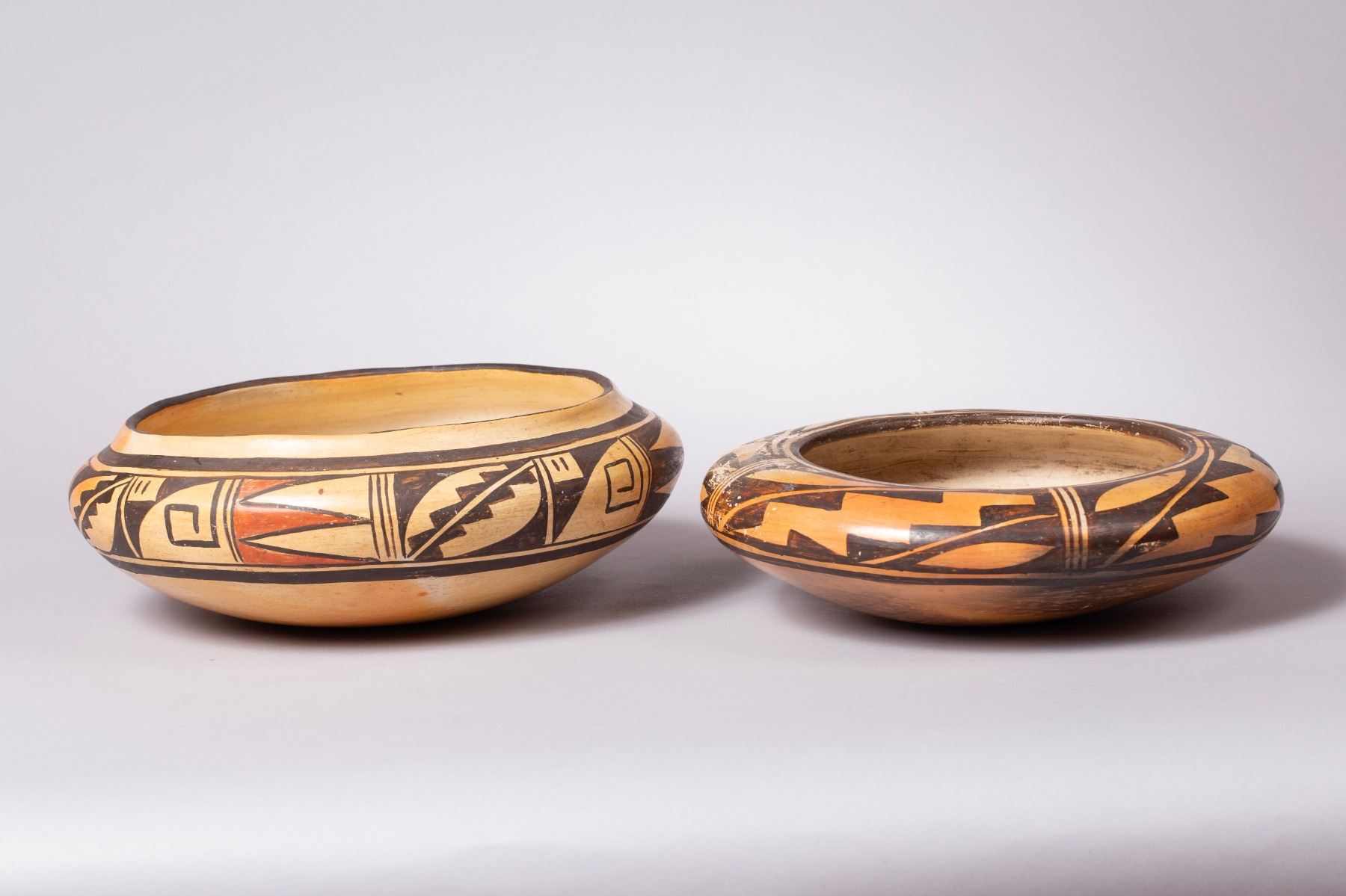 A pair of Hopi pottery bowls, each with hand-painted polychrome decoration. Bowl A features geometric patterns and measures 11.75 inches in diameter by 4 inches high. Bowl B has intricate motifs and is 10.5 inches in diameter by 3 inches high. Both display traditional firing and hand-building techniques of the period.
