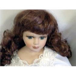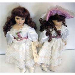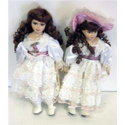 These two porcelain dolls are approximately 16 inches. They are dressed in identical early 20th century white trimmed with pink Southern Belle dresses. They have long blond curls and blue/green eyes with very long lashes. One is wearing a matching sun hat. They are in good condition.