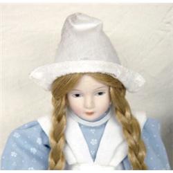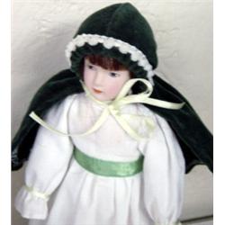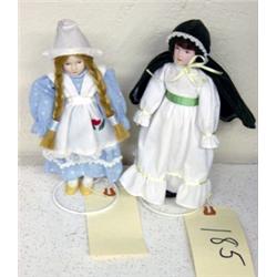 These two porcelain dolls are approximately 8 inches. Their heads, hands and legs are made of porcelain. One has very long blond braids and is wearing a blue and white dress with a white apron and white hat. The other doll is wearing a white dress with a green sash and a hooded cape over her long brown hair. Both dolls have their own stands and are in good condition.