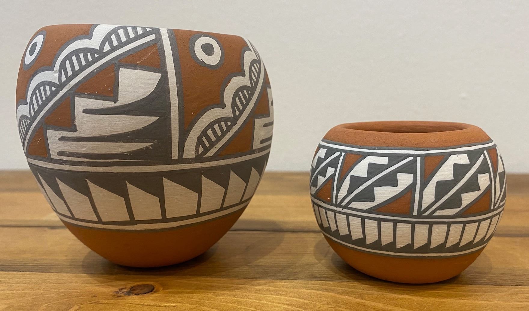 Here is your opportunity to own two pots by the renowned and multiple award-winning Jemez Potter Mary Small. The largest of the two pieces measures 3"-wide and 3"-tall. Signed Mary Small 1986. The second pot measures 2.25"-wide x 1.75"-tall and is signed Mary Small.