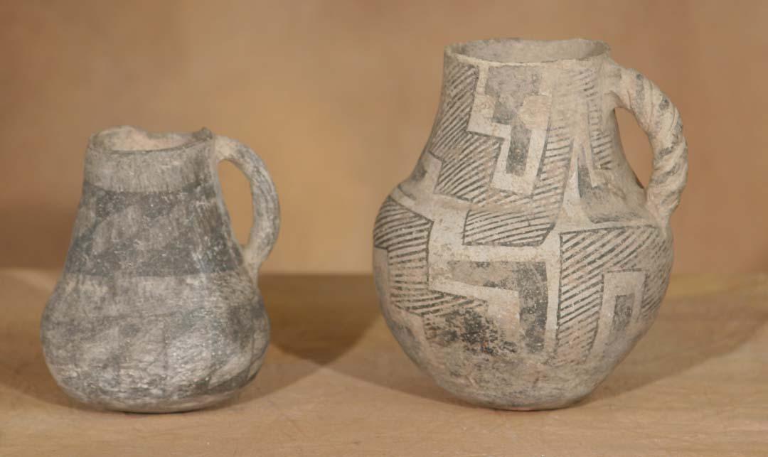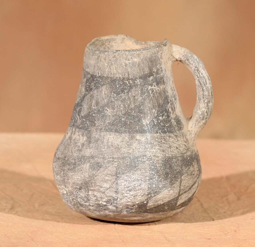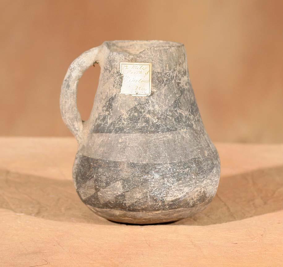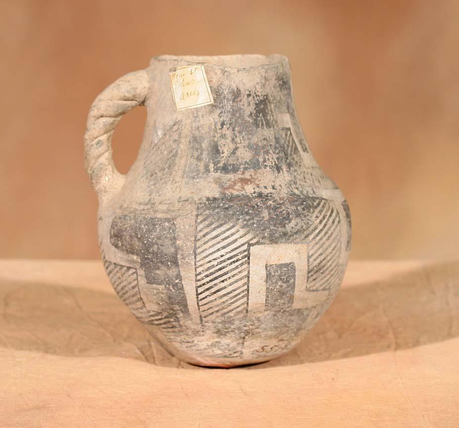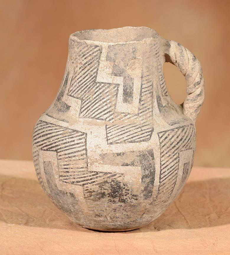 Two Prehistoric Pottery Pieces. 1) Black on White Mug. 5 ½" x 4". Bears old label. 2) Mug with Twisted Handle. 7" x 5". Black on white mug with hatched kiva designs. Bears old label. (est $700-1,500). Provenance: Bethany College, Lindsborg, KS. . For condition reports please visit: www.auctioninsantafe.com/cr2011.pdf