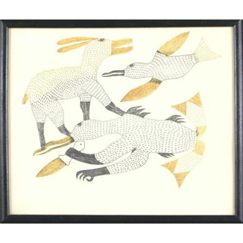 This is a classic example of Pitseolak?s work. Simple line work combined with colorful and unique representations of her everyday life and national legends. This beautifully simplistic picture is framed in an appropriately understated black wood frame. This excellent work measures 10.75? x 12.75?.