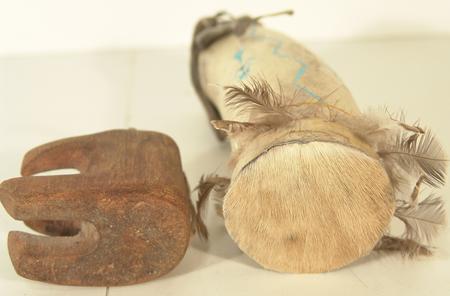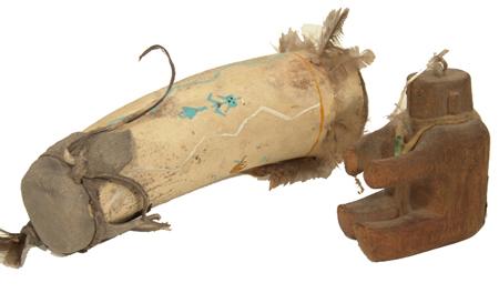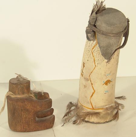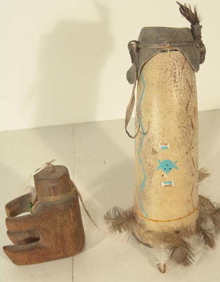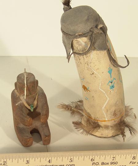 An early 1900s Navajo medicine gourd rattle/drum with painted symbols plus a 1920s Laguna carved wooden fetish done in human male form. 7" high and 3" high