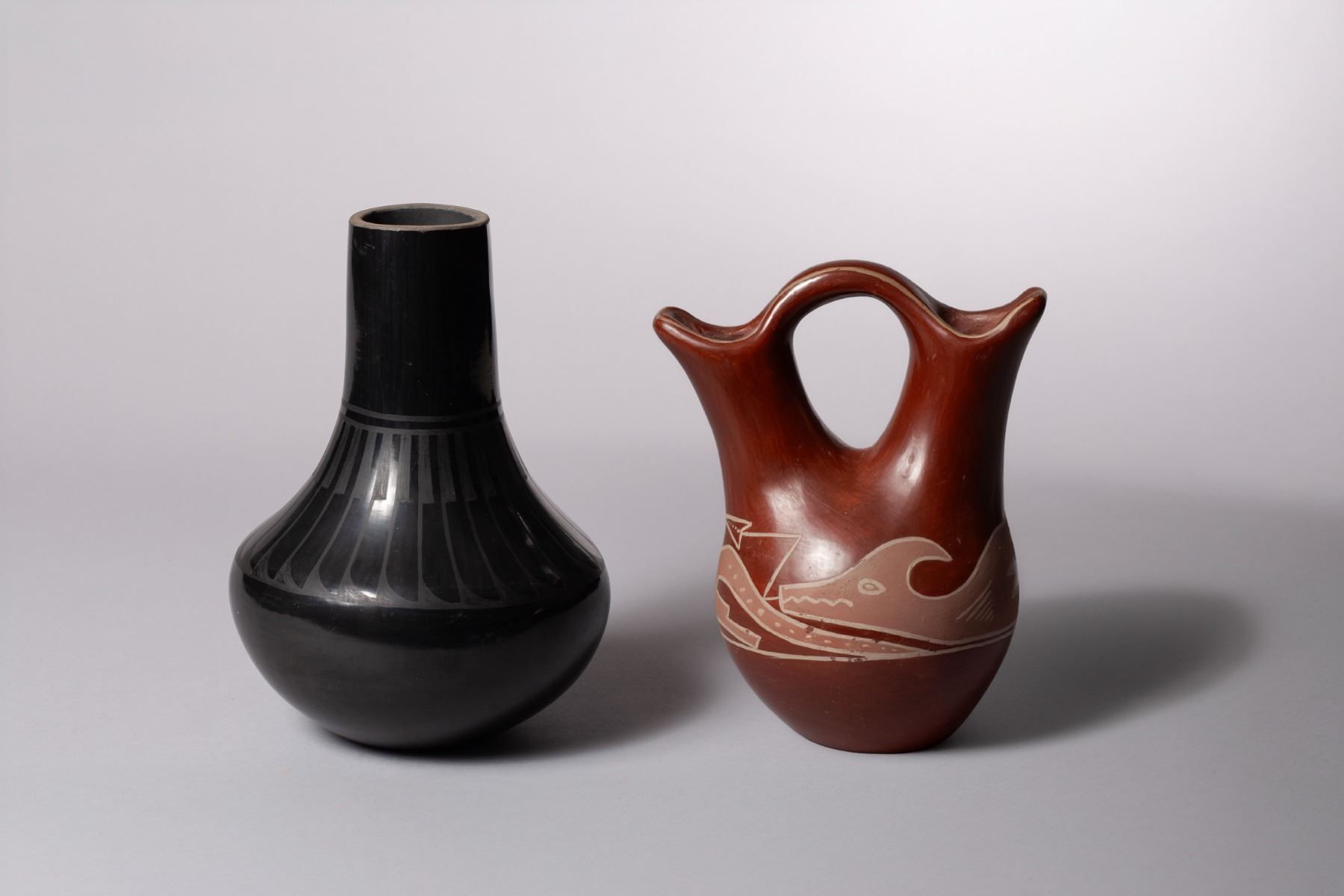 Two Pueblo Pots including aSan Ildefonso Feather Design Vase by Blue Corn and a Santa Clara Serpent