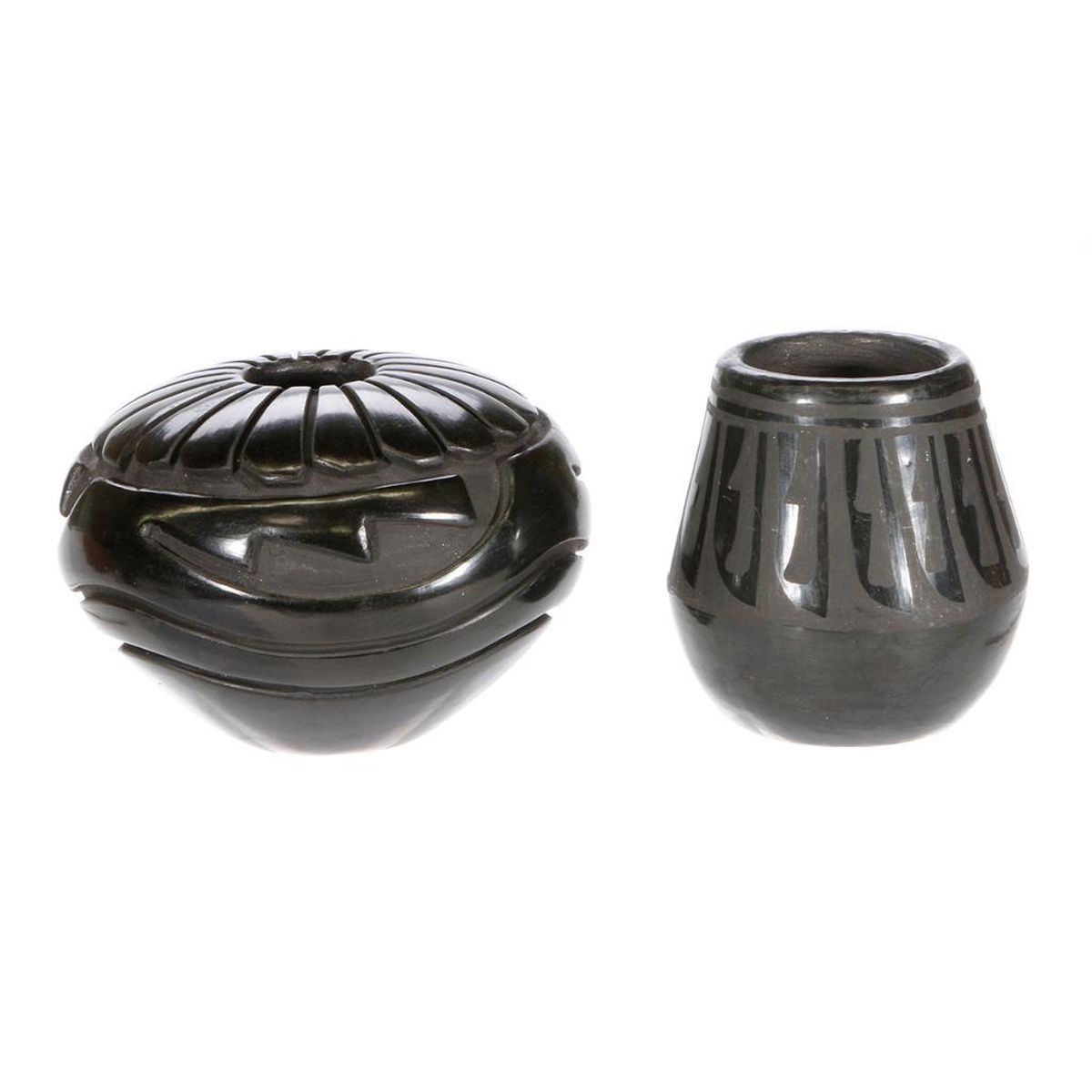 Two Pueblo blackware jars, likely Santa Clara, a carved seed jar by Denise Chevarria and a vase-form example, signature illegible