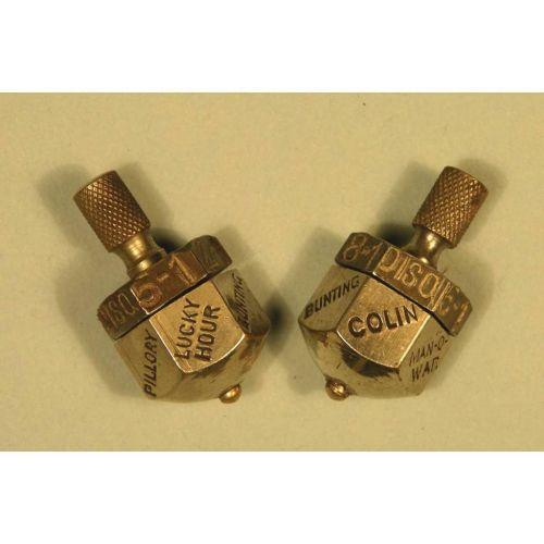 Two Put-in-Takes, nickel plated brass and iron. Both have rotating odds makers Excellent condition. 1 1/4 inches.