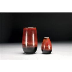 of oval or tapering cylinder form, decorated with a running glaze in shades of brown, ht. 3.8” — 9.6 cm. and 6.2” — 15.7 cm., incised marks including CHS monograms