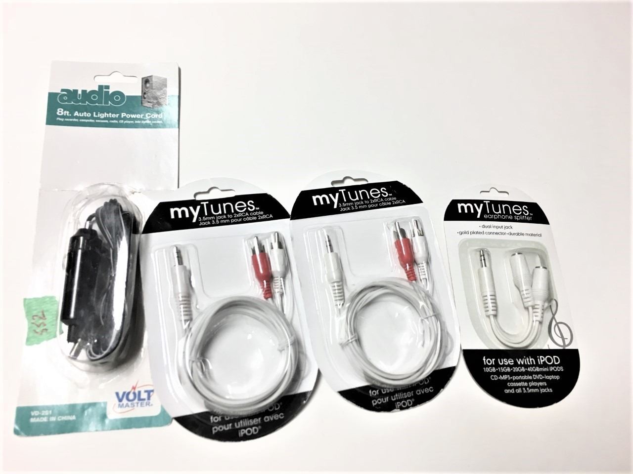 Two RCA Cables + Earphone Splitter + 8 Ft Car Lighter Cord