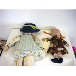 One rag doll is approximately 20 inches. She is dressed in a white dress with blue flowers with a white pinafore and a dark blue hat She has a long blond braid and brown button eyes. She is in good condition. The second 1975 rag doll is approximately 15 inches. She is dressed in a brown printed dress with a yellow stripped apron. She has orange braids and is in good condition.