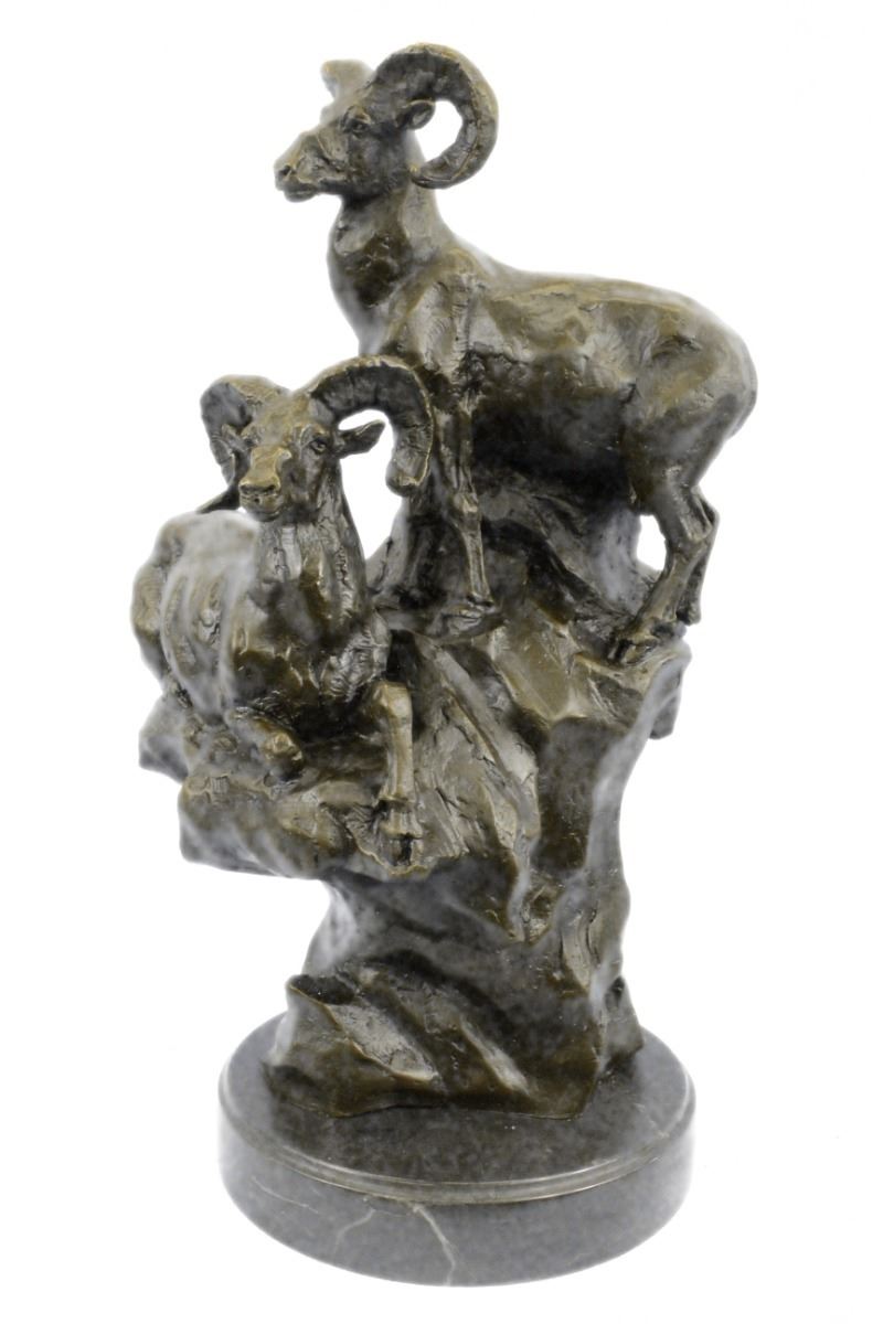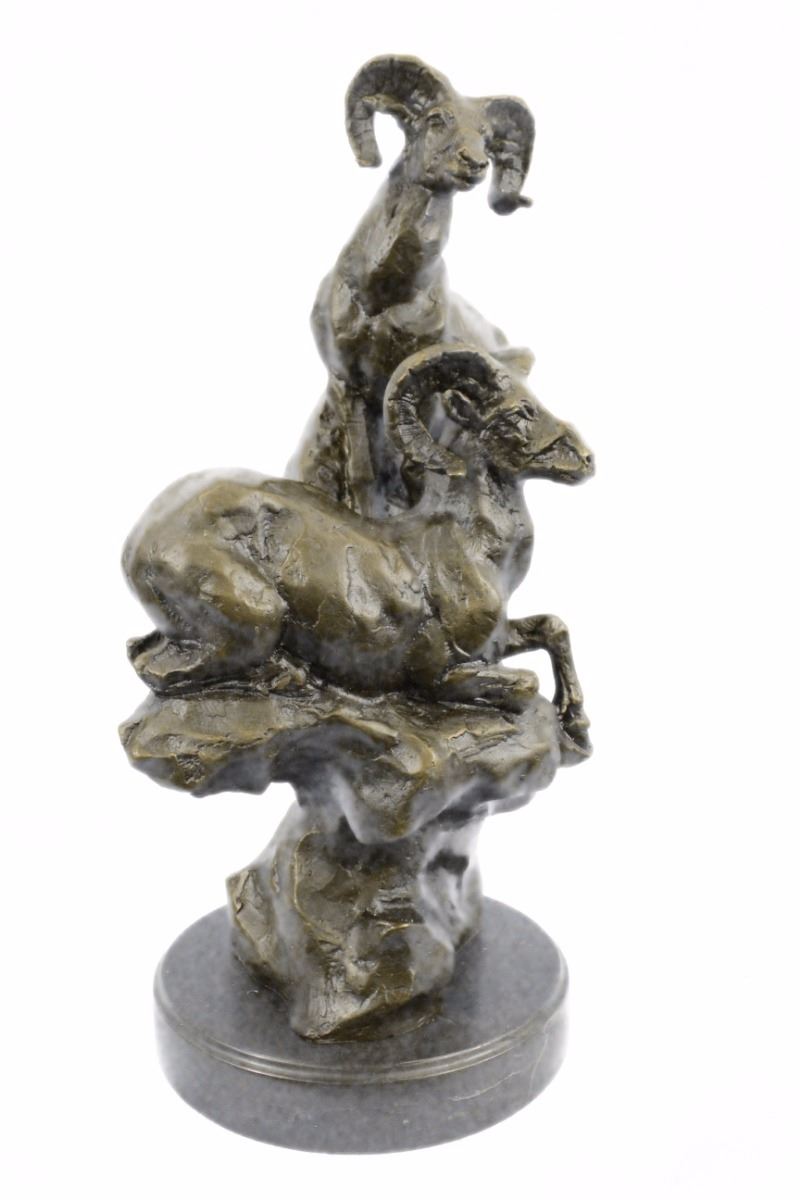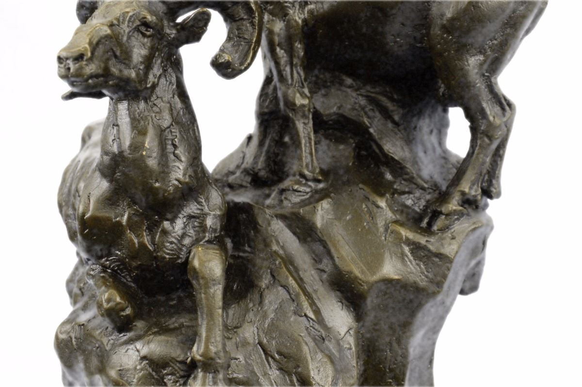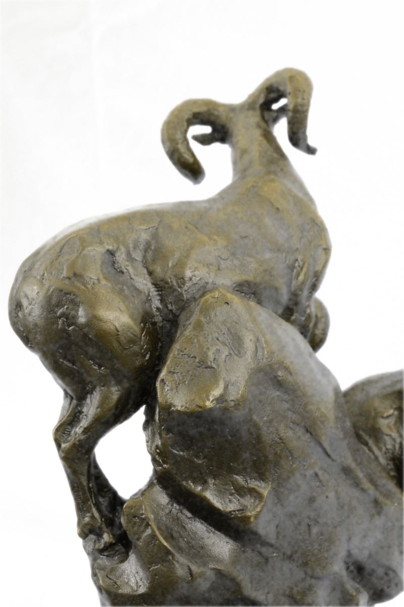 These Two Majestic Rams Resting On The High Cliffs Of A Mountain In A Carefree Manner. The Handmade Bronze Sculpture Was Cast Using The Age-Old Method Of Lost-Wax Casting And Stained With A Brown Patina Finish For Perpetuation. He Is Mounted Upon A Black Circular Marble Base. Bronze Dimensions With Marble Base: Height 19 X Width 12 inches. Weight: 27 Lbs.