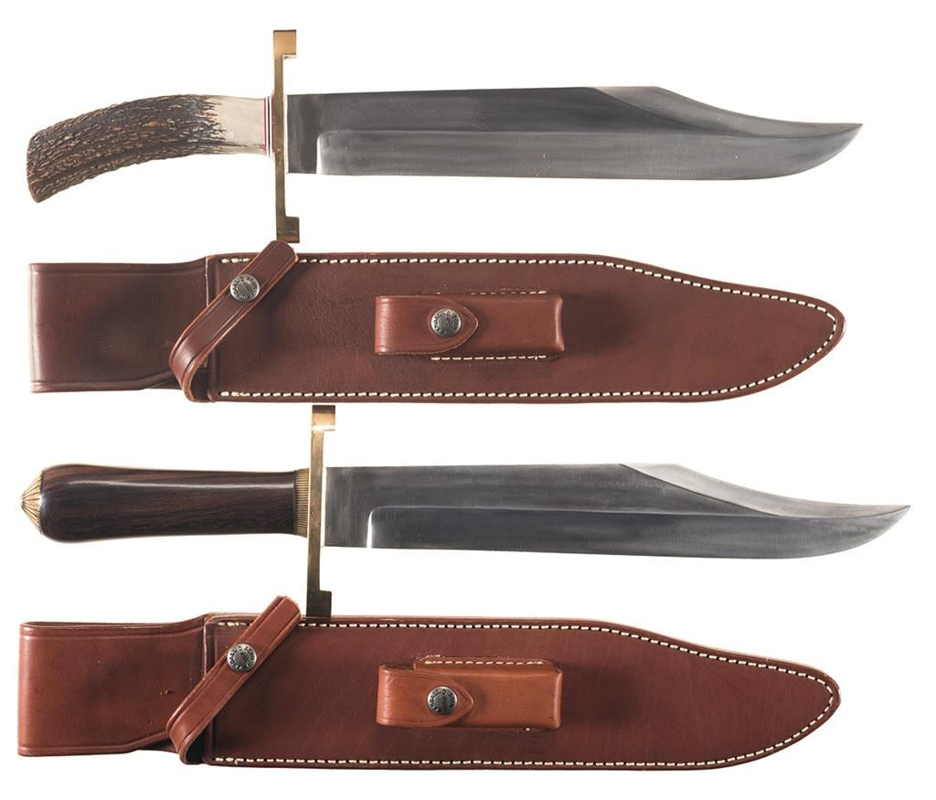 Both knives are fitted with carbon steel clip-point blades and lugged brass guards, and come with a brown leather Randall sheath and sharpening stone. 1) Randall Model 12-11 Sportsman Bowie, 15 1/2" overall with a 10 7/8" blade, stag grip and a gray cloth Randall pouch. 2) Randall Model 12-11 Sportsman, 16 1/2" overall, 11" blade, smooth hardwood grip with peaked cap style pommel. Excellent overall.