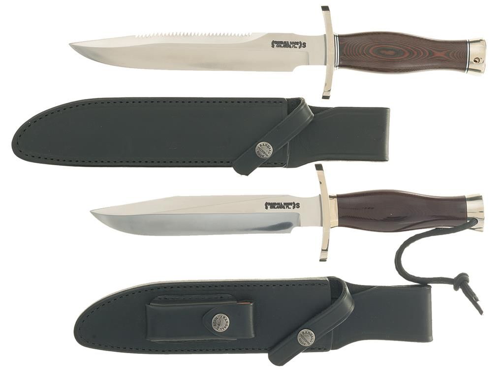 Both knives feature stainless steel blades, nickel silver upturned oval guards, micarta "commando" grips, nickel silver pommel caps with lanyard holes, black leather Randall sheaths and black Randall knife pouches. 1) Randall Model 1-8 knife, 12 3/4" OAL, 8" sawback blade, red/brown/black grip with black and silver washers. 2) Randall Model 1-7 knife, 12" OAL, 7" blade, red/brown grip, black paracord wrist strap and sharpening stone. Very good to excellent overall.