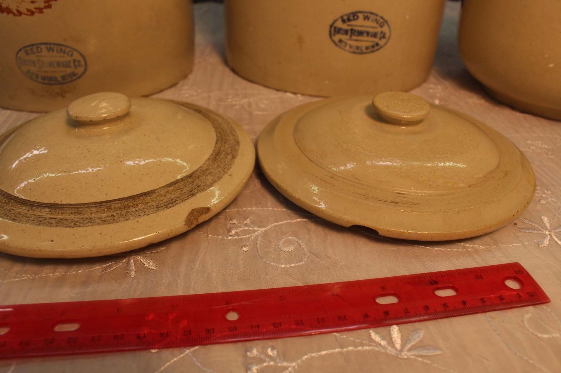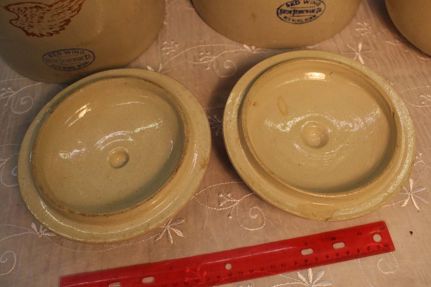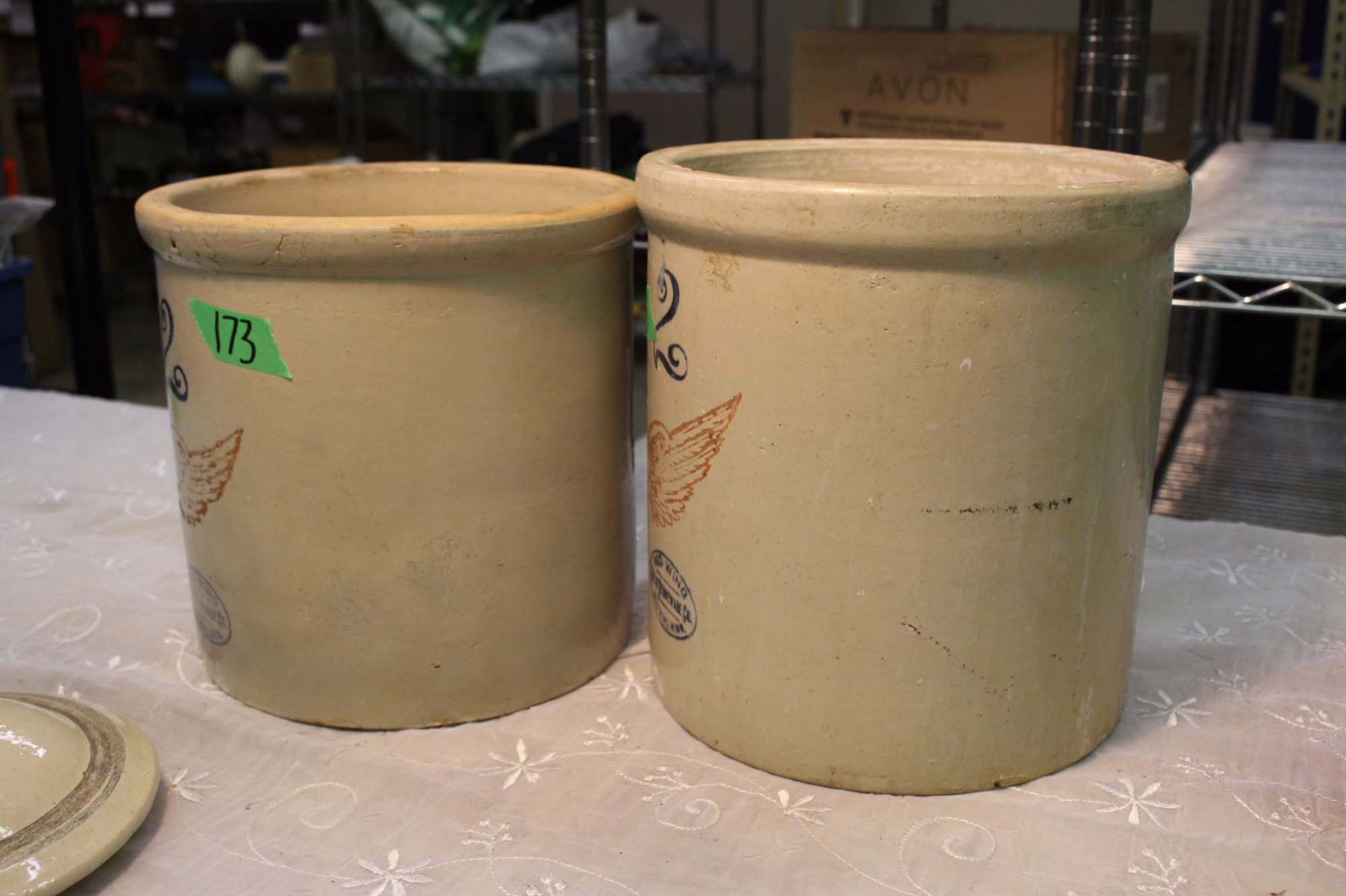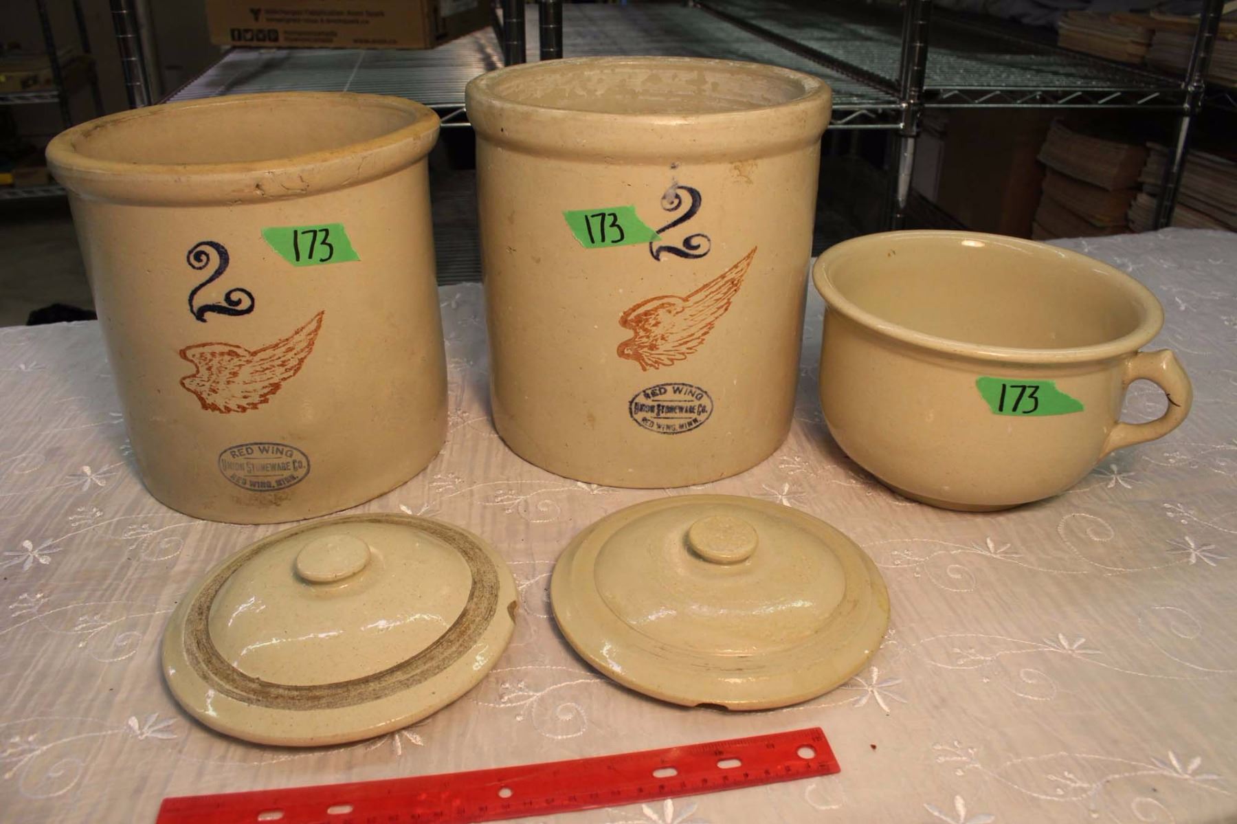 Two Red Wing Crocks (Size 2), Two Crock Lids (Size 1)& Crock Bowl