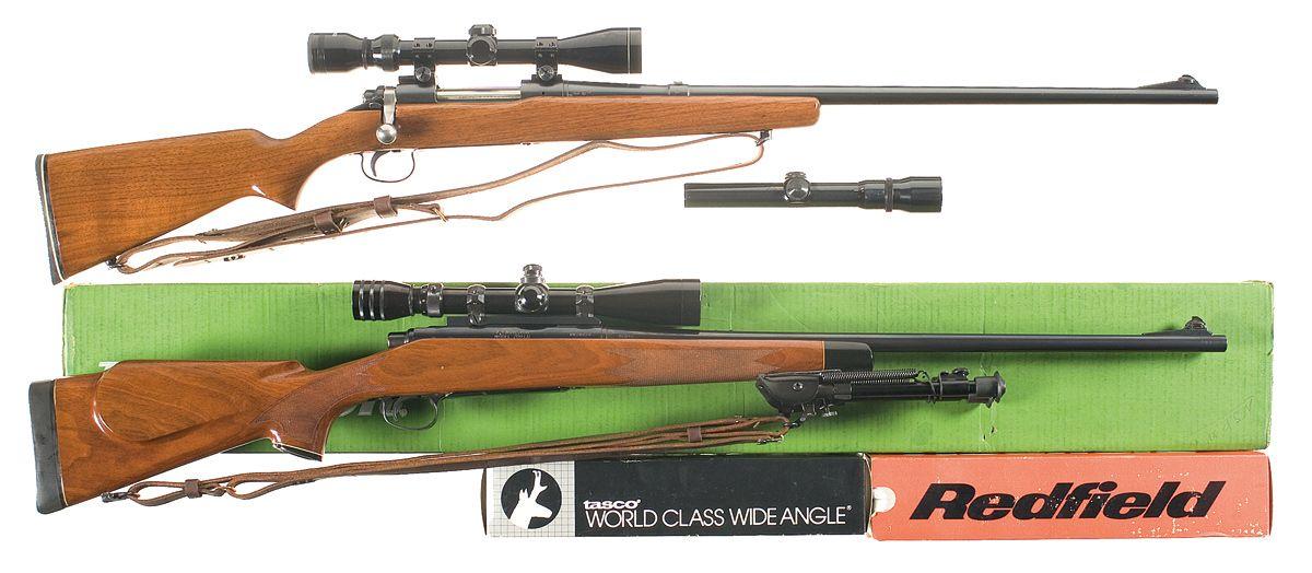 B) Ramp blade front sight, barrel drilled and tapped for a sight mount near breech, bipod, Redfield 3x-9x scope (with box) with Redfield mounts (rings engraved), jeweled bolt, solid factory recoil pad, leather sling. With factory box numbered to gun.