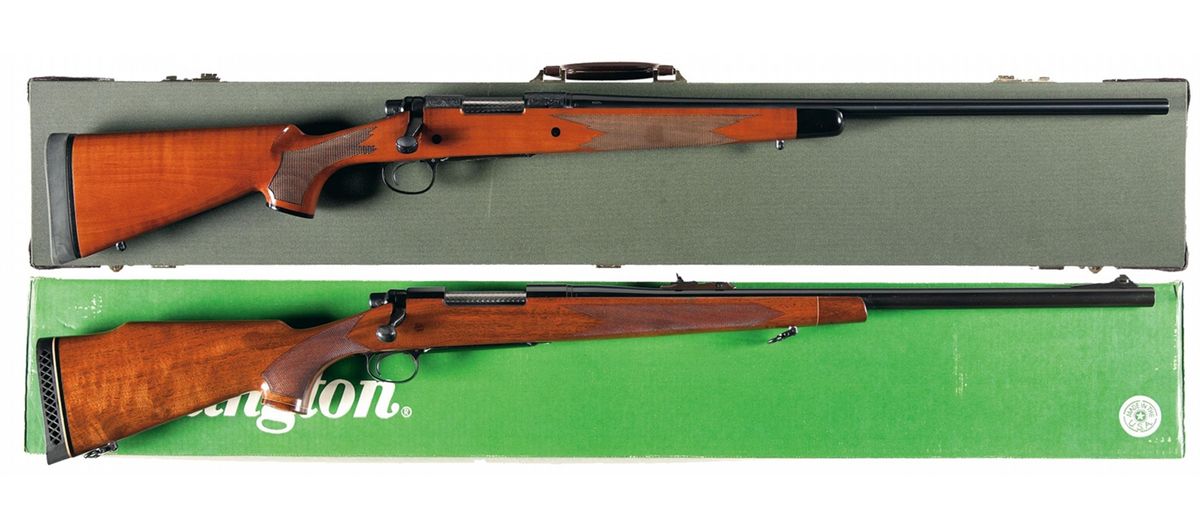 - B) Introduced in 1962. Ramped bead front and adjustable rear sights, receiver drilled and tapped for scope mounts with a hinged floor plate. Fitted with a checkered Monte Carlo stock with contrasting forearm and grip cap. Vented factory recoil pad and sling swivels attached. Complete with green factory box for a Remington 700 Classic in .300 Weatherby caliber.