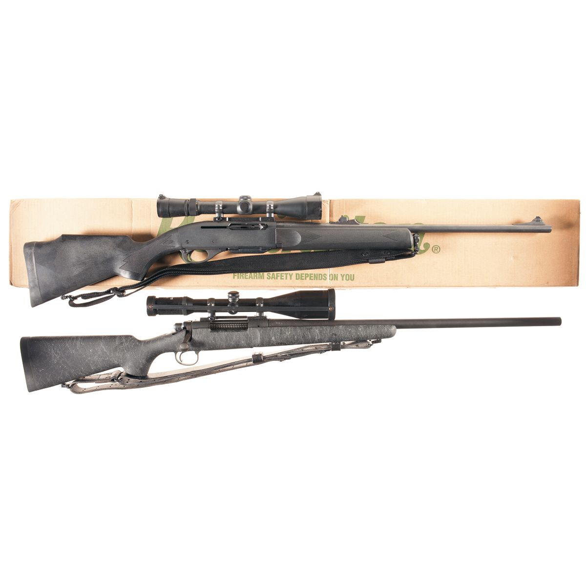 With Weaver 2-10x scope, Butler Creek lens caps, black web sling and box numbered to gun.