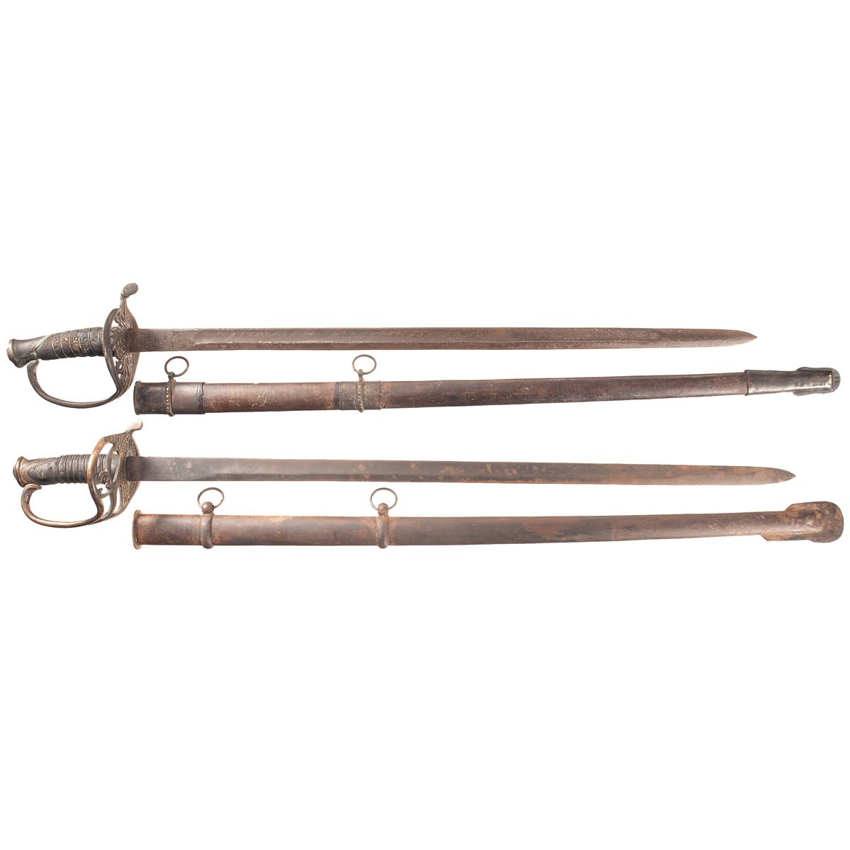 1) 29 1/2" blade, hand stamped "BOYLE GAMBLE/&/CO.", with Confederate-style decoration. With iron scabbard. A fair reproduction. 2) Hand stamped "LEECH & RIGDON", Confederate-style decoration, 30" blade, brass hilt, leather and wire grip and a metal scabbard. Grip poor, otherwise fair.