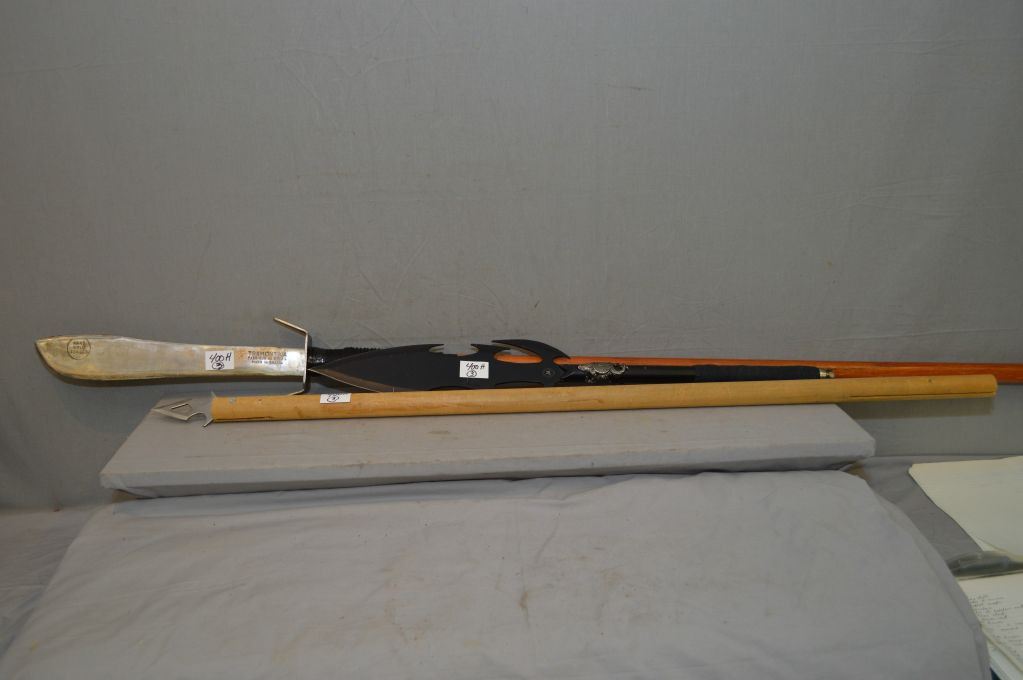 Two Reproduction Spears [ wooden w/point - TRAMONTINA Made in Brazil Bolo Forged ] & One Reproduction Spear Head w/dragon emblems