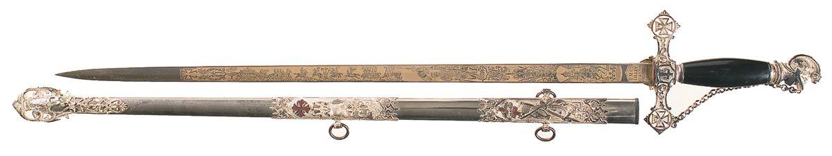 A) Fixed sights, 1920 patent date, standard markings and smooth replacement grips. Ejector rod included. With a M.C. Lilley (Columbus, OH) Knights Templar sword, acid etched and gold washed, "Luther Harley Hinkley" on the blade, chain guard and sheath.