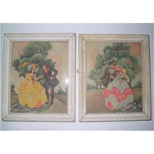 Two very charming and colourfull romantic prints, framed under glass. On the upper left and right corner of the pictures, partially covered by the frame, it is printed: Benton Glass Co. R.185-22 and Litho in USA. The other picture states the same with the numbers 185-21. Each picture shows a beautiful young lady taking a stroll in a country park like setting. One young lady is auburn haired and wears a pretty blue dress trimmed in pink and holds a parasol, while she strolls hand in hand with her young man wearing top hat and tails. The other picture shows a lovely dark haired young lady in a yellow dress trimmed in blue ribbons as she offers her hand for a kiss to a prospective suitor perhaps? Lovely country setting with a church steeple in the background. The prints each measure 4-3/4" inches wide by 5-3/4" inches in height (framed measurement.) The frames are wood and painted in an antiqued off-white colour. The prints and frames are in excellent condition but there is some discoloration to the backing boards, as shown in picture.