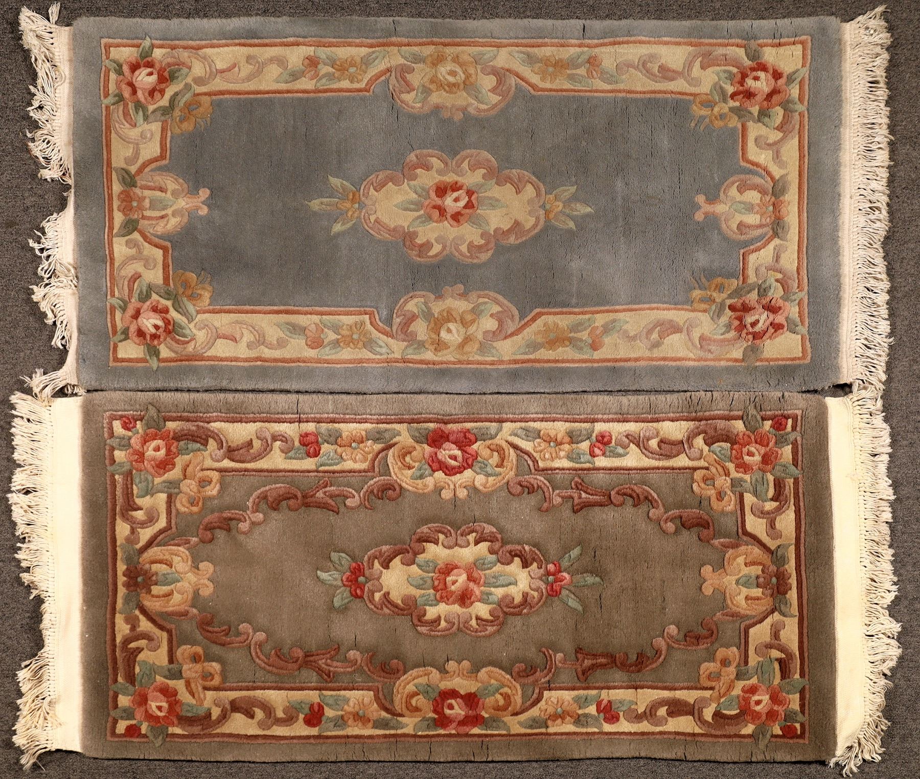 This lot has two rug runners; both are 27 in. X 48 in. with fringe edging. Both have a rose pattern in a thick nap pile, cotton bland fabric. The colors are grey, the other blue-grey. In good condition but need cleaning.