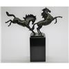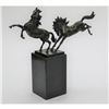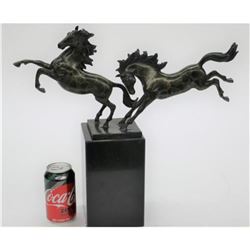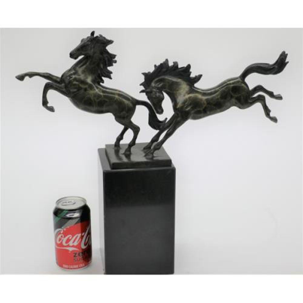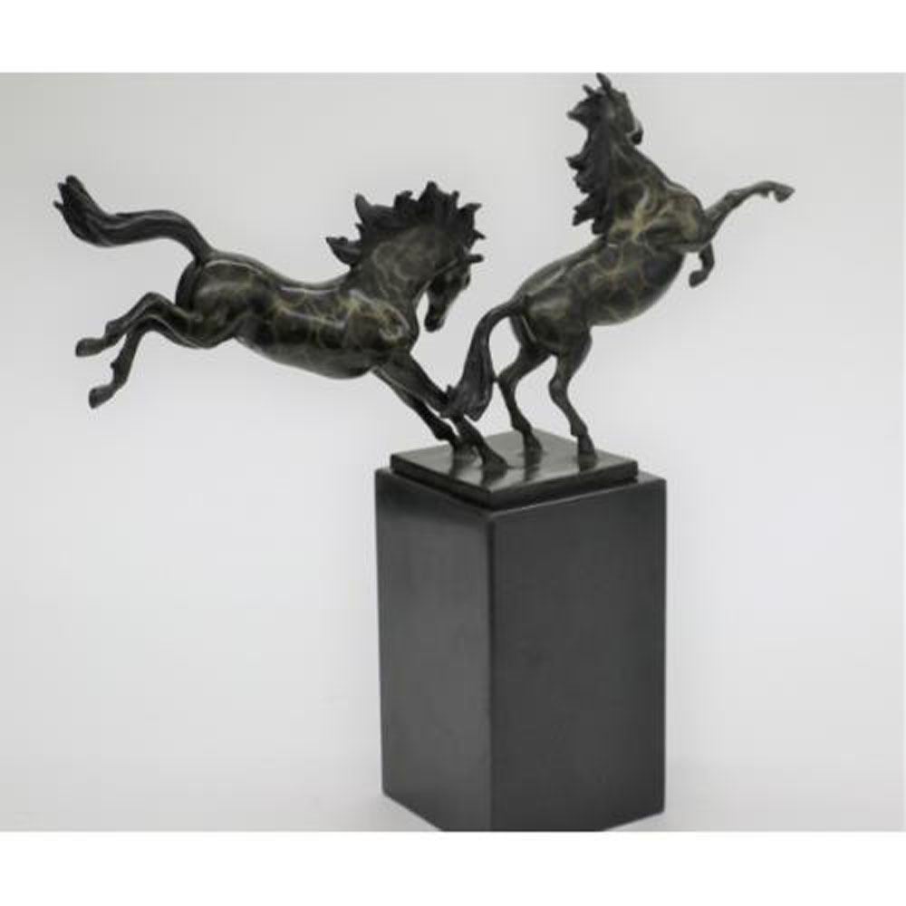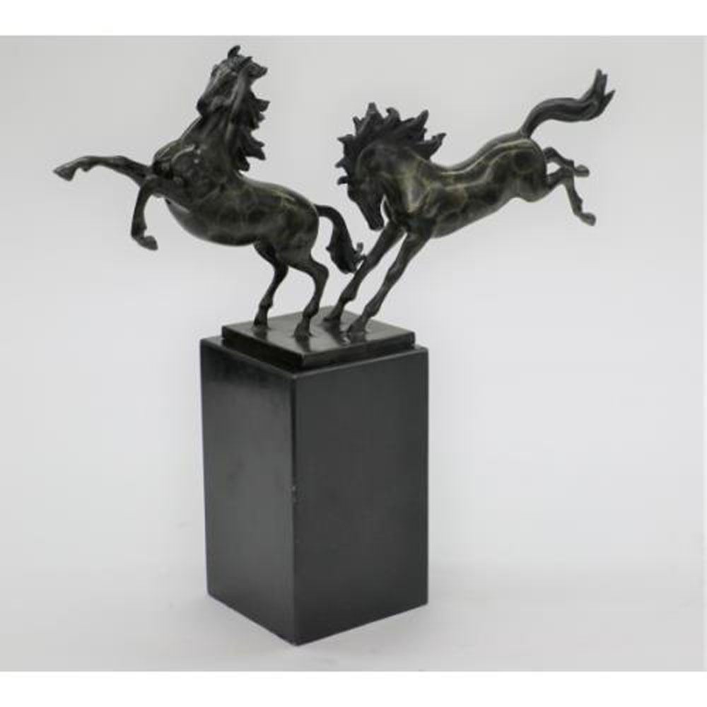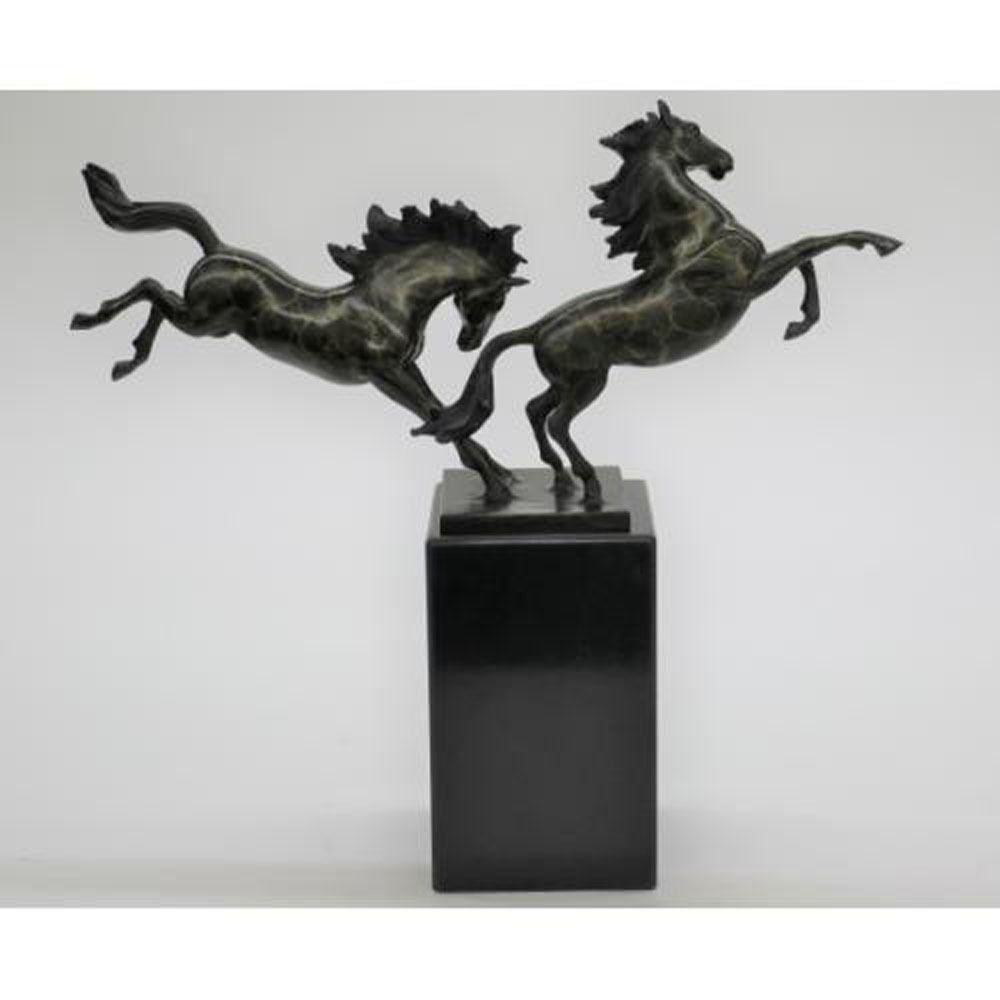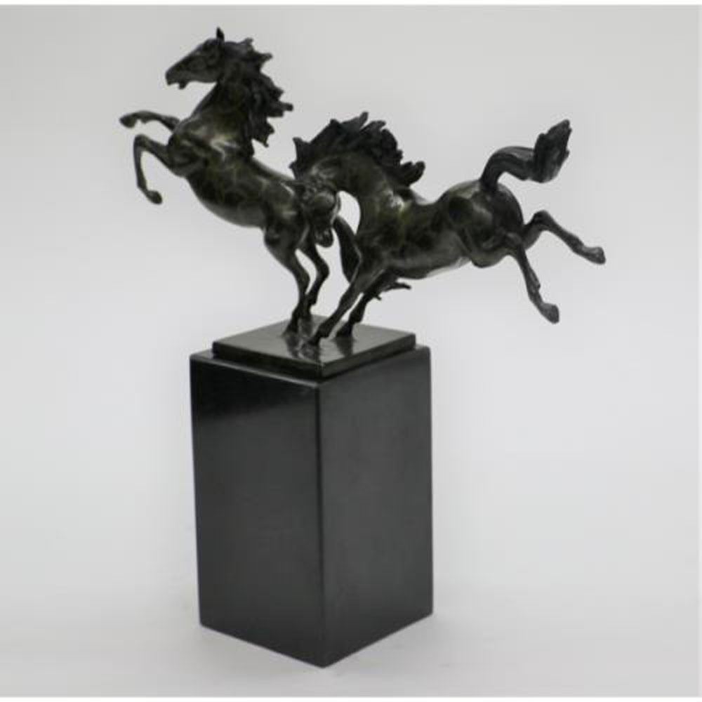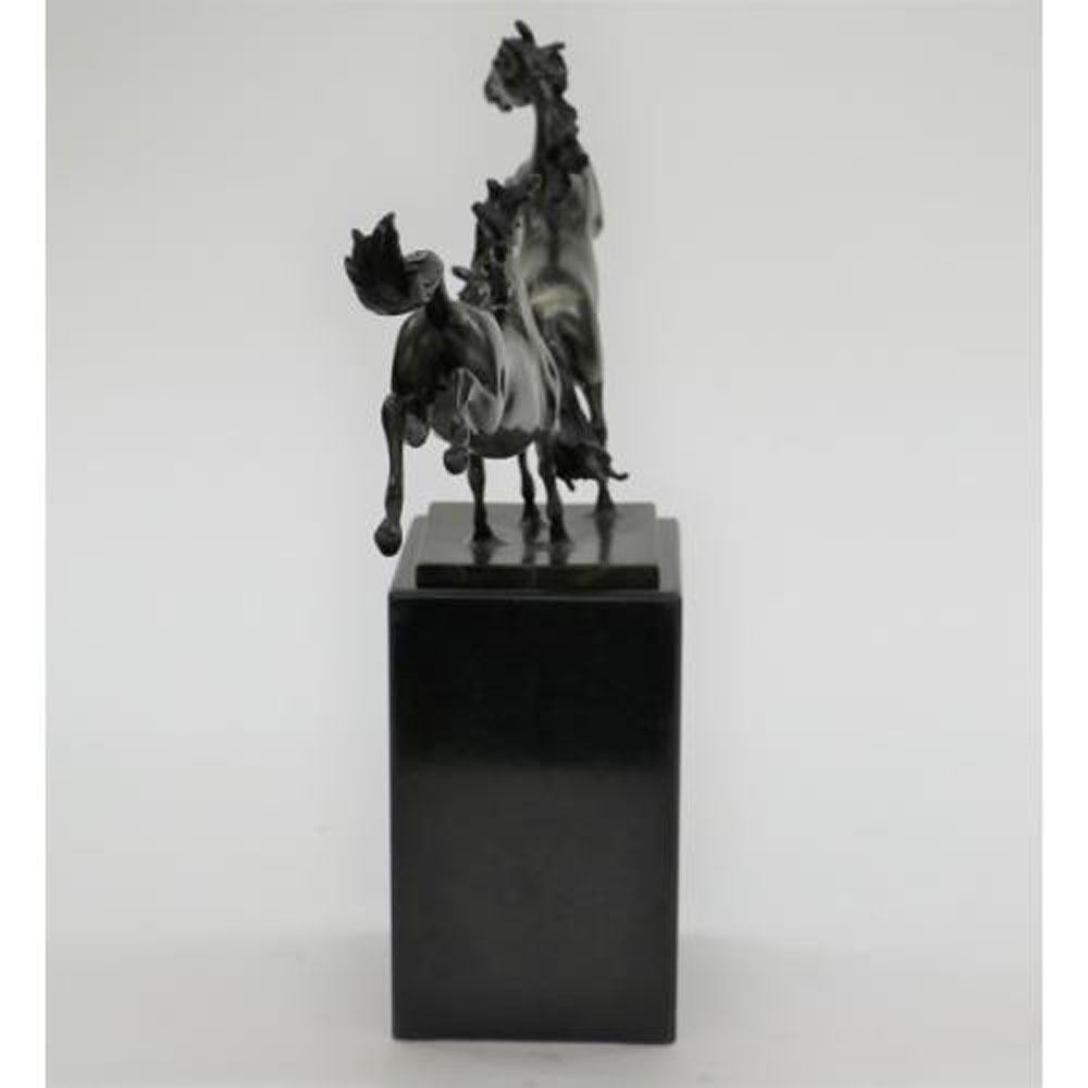 This bronze sculpture of two horse bucks onto its hind legs resisting a force the beholder cannot see. The horses kick his forelegs into the air as both lets out an authoritative neigh of discontent. It balances upon a sphere that is decorated with dragon like legs. Serving man in war, mobility, productivity, agriculture, development of all kinds, the horse is by far one of the largest contributors to the enhancement of our civilization. With such recognition and accomplishments, a vast and diverse trail of symbol meanings is sure to follow the horses rich history with humankind. Some that are seen in this sculpture are power, grace, beauty, nobility, strength and freedom. The sculpture was cast using the age old method of lost wax casting and stained with a multi Color Brown Patina finish for perpetuation and is mounted upon a bronze plinth. Bronze Dimensions with Marble Base: Height 17 X Width 18 Inches. Weight: 17 LBS.