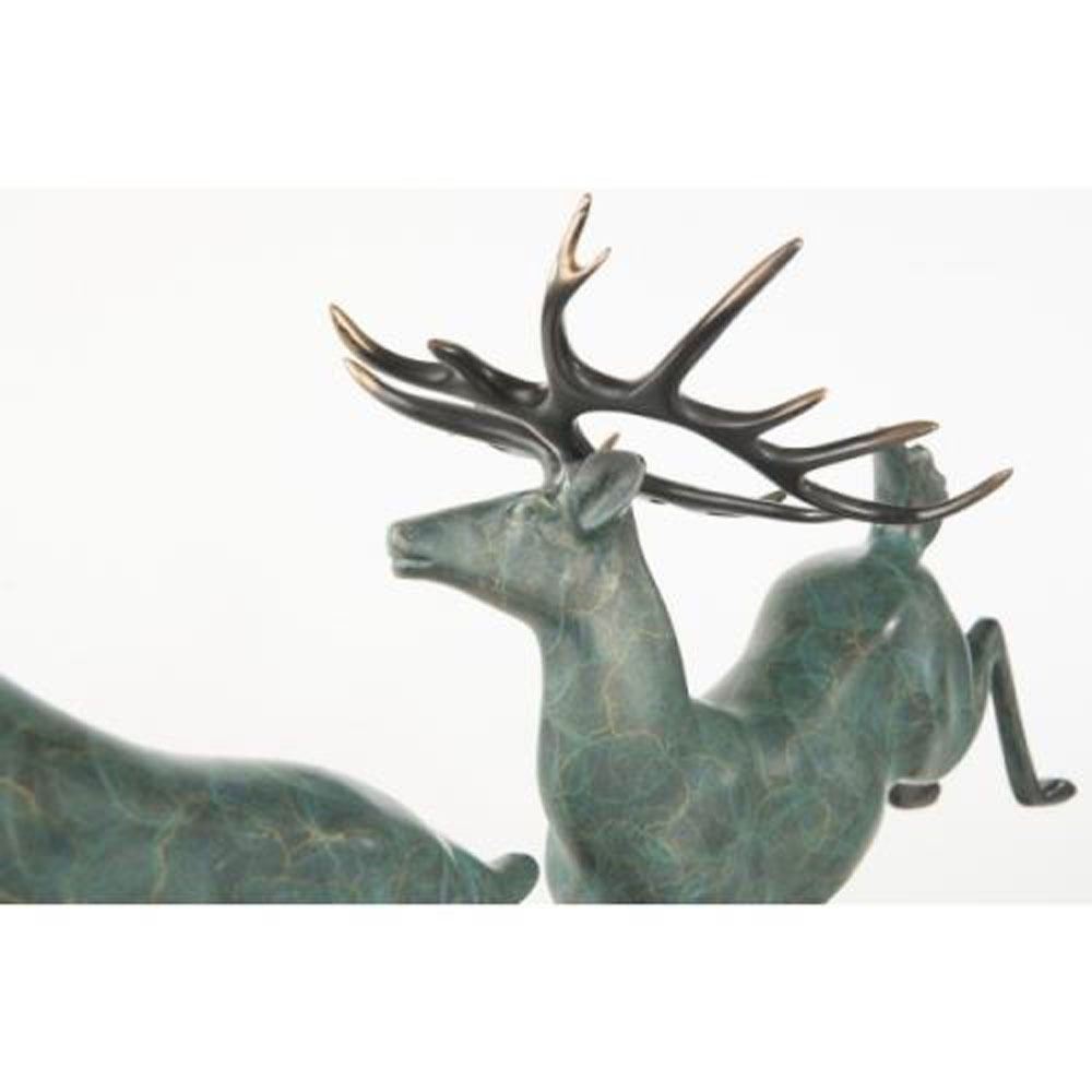 The two males have pushed the limit and try to push each other away in a tiring feat of strength. This Bronze Sculpture is molded using the ancient method of lost wax casting and stained with a Multi Color green patina finish for preservation. They are mounted upon a wooden log base. Bronze Dimensions with Wood Base: Height 17 X Width 28 Inches. Weight: 23 LBS. Lost Wax Casting has been around for thousands of years, yet few people understand how the process actually works. Although mechanization has facilitated the lost wax process of bronze casting, the procedure is the same as that used by the Chinese when they first developed the process in the Second Millennium BC.