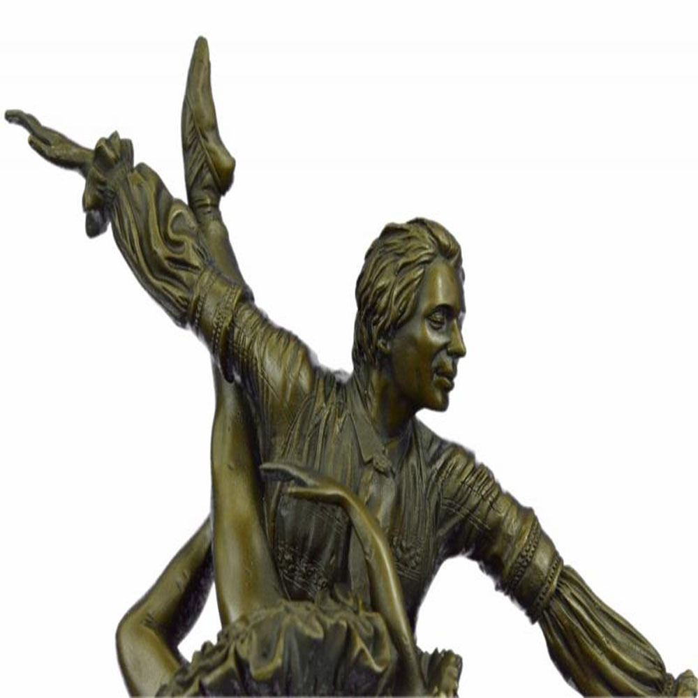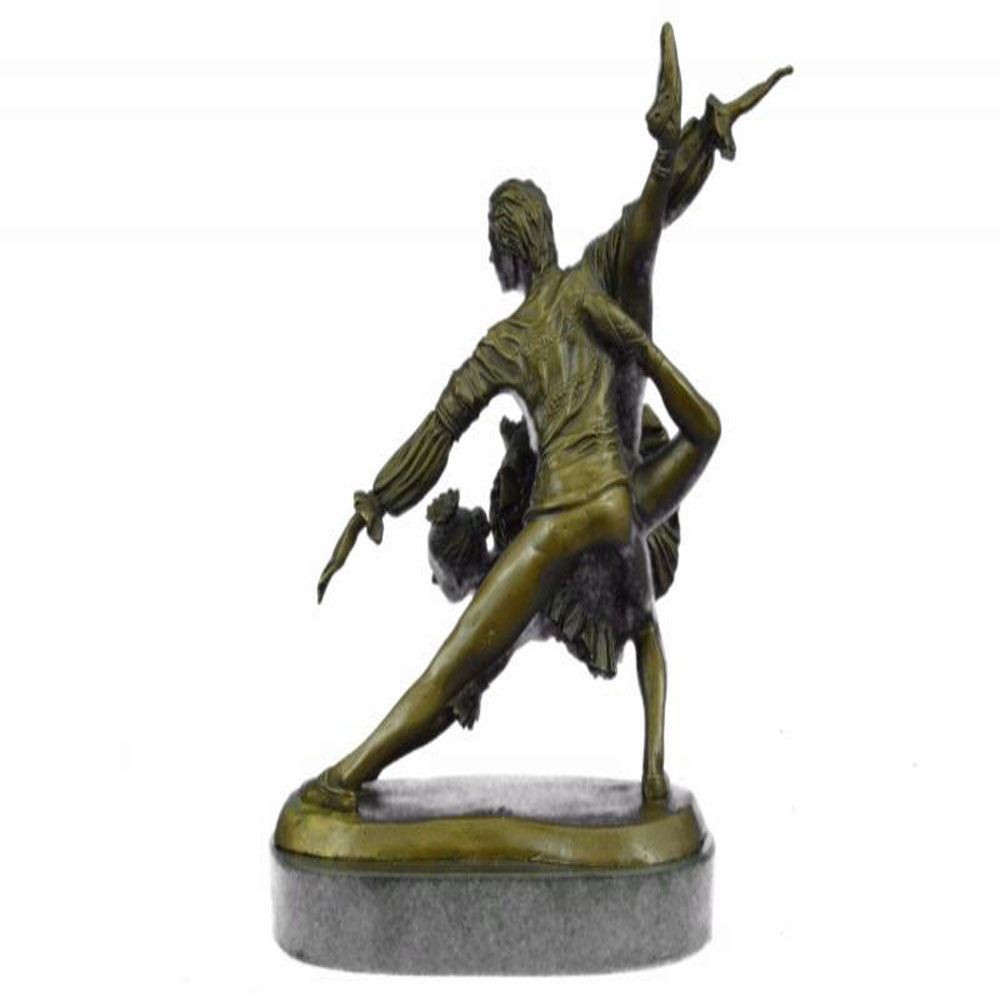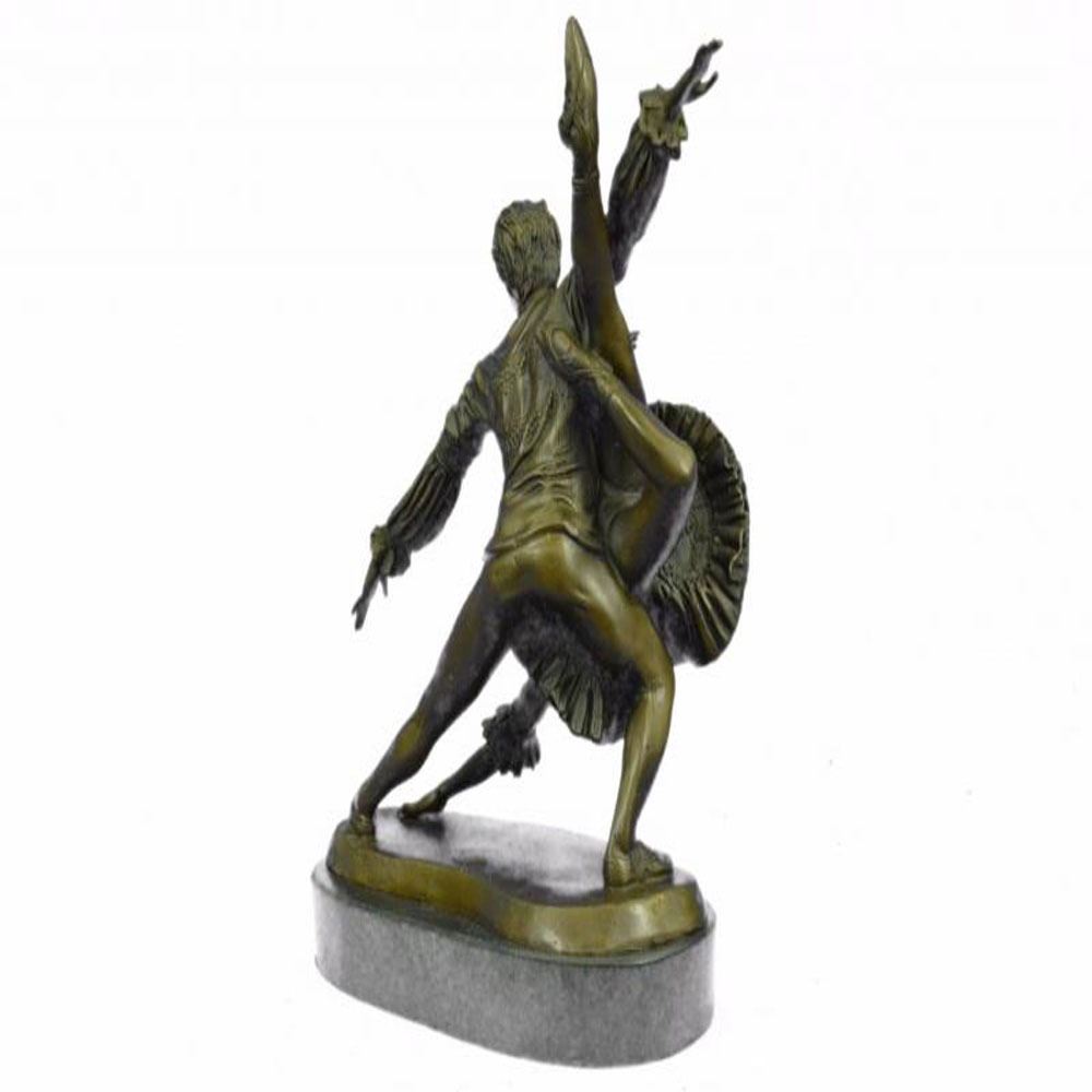 The bronze ballerina stands to balance all of her gentle weight on her partners, while he supports her on his right leg. She daintily masters her attitude en pointe dance pose as her left leg curves backward holding herself from his back. Her right leg is straight upward and her foot pointed as well. Her right arm is touching the floor and the other arms are gracefully behind her body. The handsome and strong young man spreads his arms out as his left leg is straight out, pointing his toes. They stay focused and balanced at all moments. This delicate figure was molded using the lost wax method of casting and finished with a brown patina tarnish and flits upon a marble base. Bronze Dimensions with Marble Base: Height 11 X Width 12 inches. Weight: 11 LBS.