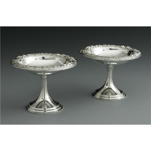 <B>Two American Silver Compotes</B></I><BR>S. Kirk & Son, Baltimore, MD, Mid-Twentieth Century<BR><BR>The raised compotes with floral repousse rims, marked underside, total weight 14.2 Troy ounces<BR>4.7in. high x 6.2in. diameter