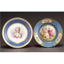The first, with a central portrait of Marie Antoinette, signed Moreau, within a bleu celeste border and gilt decorated rim; the second, depicting a couple in a landscape on a bleu celeste ground with three polychrome decorated floral cartouches. Each with 'SÅvres' factory marks; the first with name identification.