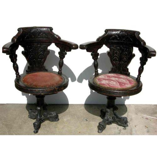 Two Saloon Chairs with cast iron bases and reversible seats. Good original condition. 33 1/2 inches tall.