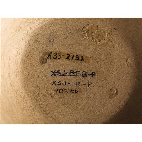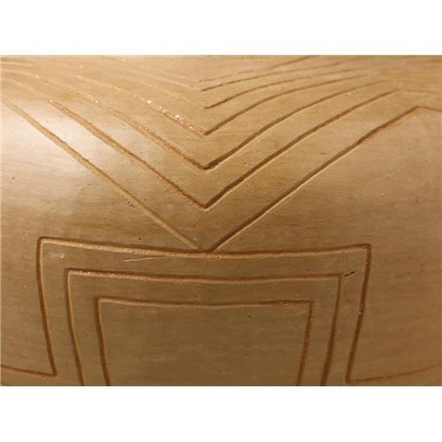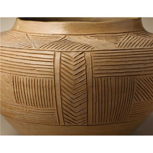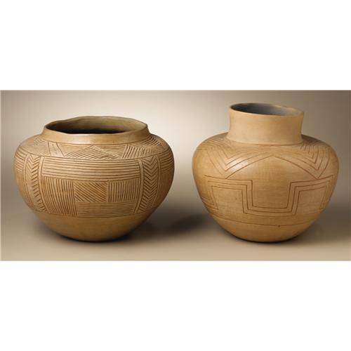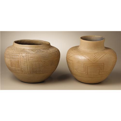 <B>Two San Juan Buffware Jars</B></I><BR>Circa 1930<BR>(A) Height 6 1/4 in. Diameter 8 3/4 in.<BR>(B) Height 7 1/2 in. Diameter 8 in.<BR><BR>The first example is characterized by a flat base, flaring sides, and a high shoulder tapering to a short neck. The jar is made of micaceous clay decorated with incised linear designs in rectangular, triangular, and chevron patterns. The rim and underbody are polished.<BR>The second example is characterized by a flat base, flaring sides, high shoulder, and a tall neck. This jar is also made of micaceous clay and decorated with incised linear designs in castellated bands around the center and a chevron pattern around the shoulder. The body is lightly polished while both neck and underbody are unpolished.<BR>The incised pottery popular with San Juan artists was based on prehistoric examples excavated at the nearby Otowi ruins. These two examples reflect a contemporary interpretation of the ancient decorative process.<BR><BR>Provenance<BR>Denver Art Museum<BR>Christie's, Sale 1332, Lot 74, January 12, 2004.<BR><BR> <BR><BR><B>Important notic