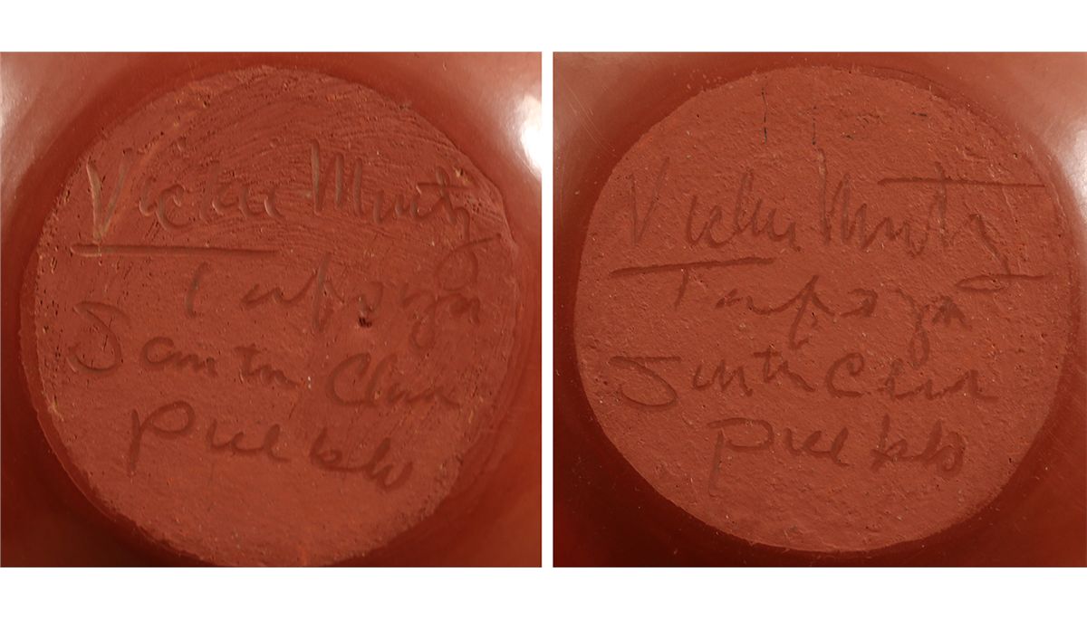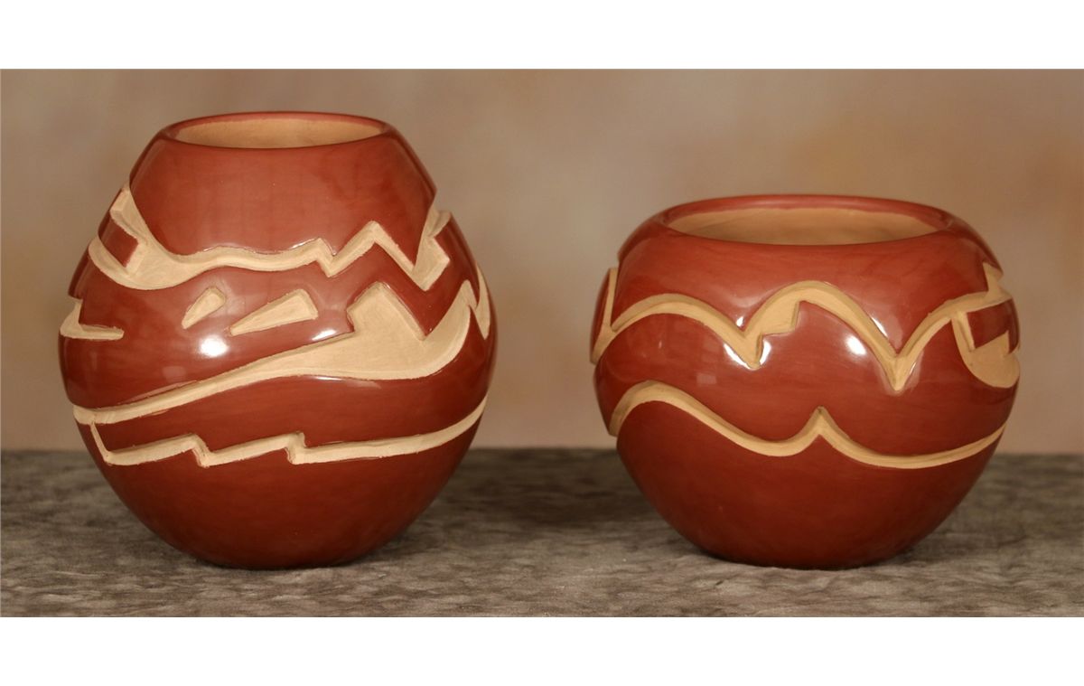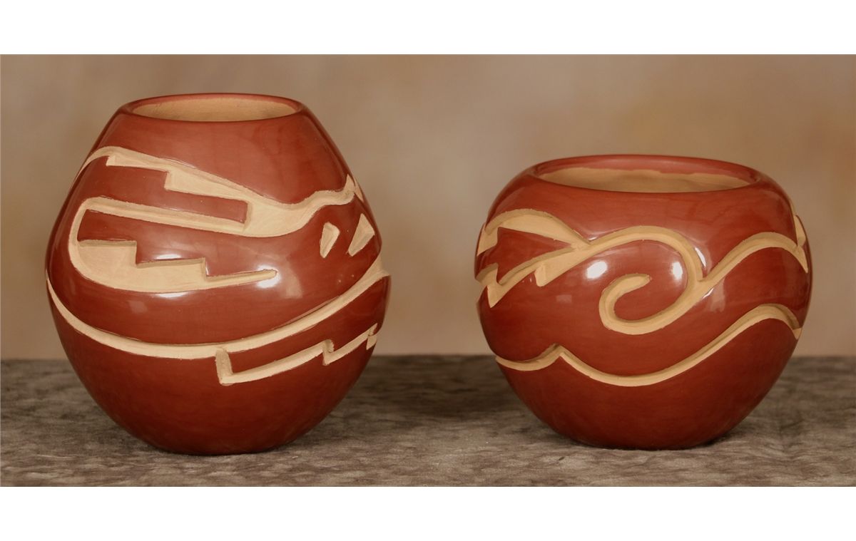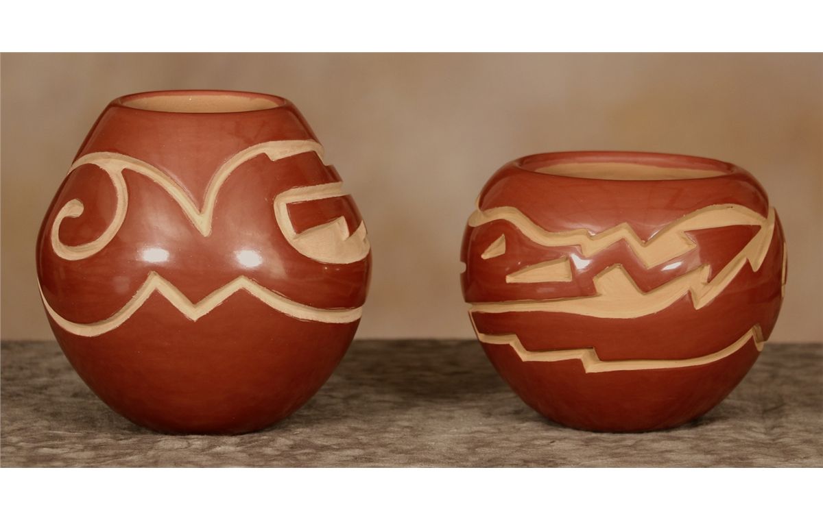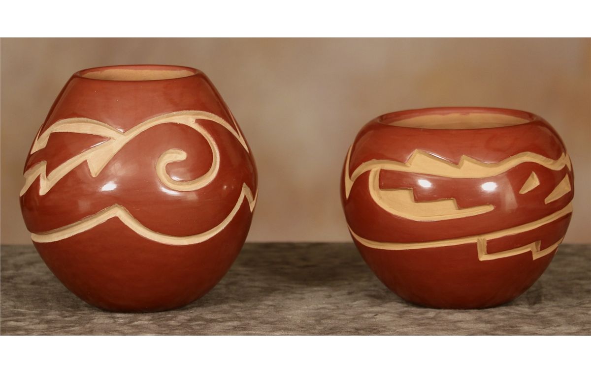 Pair of Santa Clara Jars by Vickie Martinez (1967 - ). 5.5" x 5" and 4" x 5.5". Two polished redware jars both with a deeply carved Avanyu design. Each signed on base: Vickie Martinez Tafoya, Santa Clara Pueblo. Provenance: Indian River Gallery.