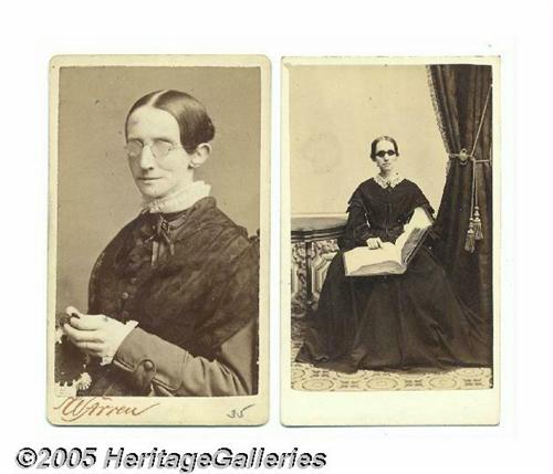 <B>Two Scarce and Important Cartes de Visite of Laura Bridgman</B></I> Laura Bridgman, 1829-1889, the first blind and deaf person to be successfully educated, born Hanover, New Hampshire. Under the guidance of Dr. S. G. Howe, of the Perkins School for the Blind, she learned to read and write and to sew, eventually becoming a sewing teacher at the school, where she remained until her death. As a girl and young woman, Bridgman was famous, her life and education described in newspapers and magazines worldwide. Her fame was later eclipsed by that of Helen Keller. One carte de visite by Warren, one by Black of Boston. Minor spots detract little, rare. Lot:251
