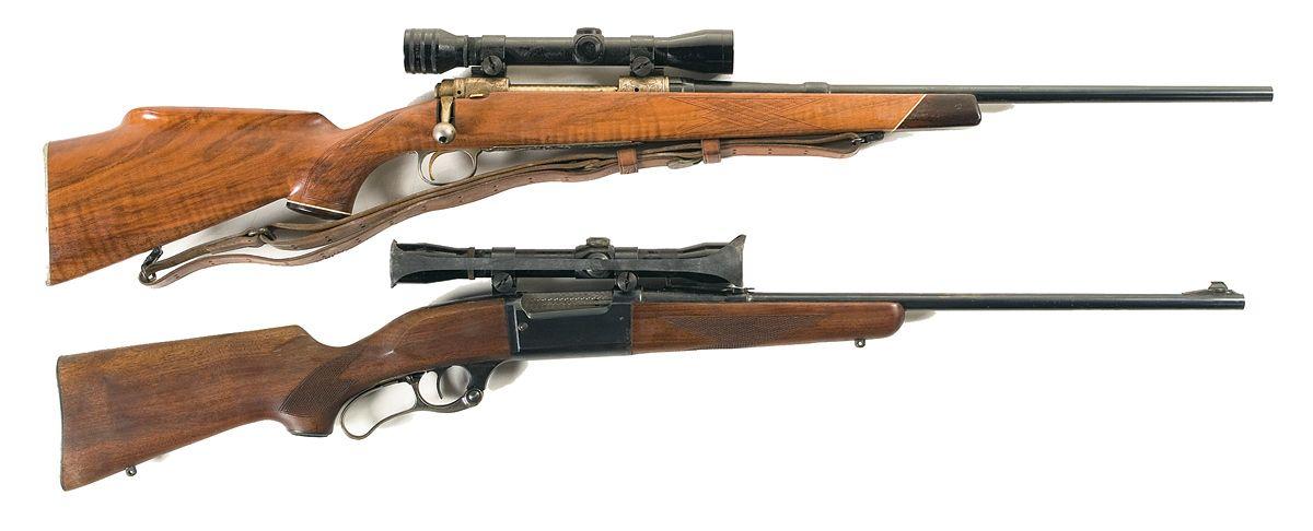 A) Produced from 1968-70, deep relief floral engraved and coin finished receiver, floor plate and trigger guard, with stag scene on floor plate. Barrel produced without sights, jeweled bolt, Redfield 4x scope with weaver mounts, leather sling. A semi-dried coat of grease has been applied to rifle.