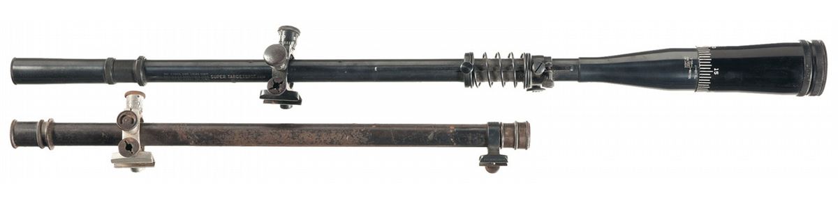 Winchester A5 scope with elevation and windage adjustable mount. Good with oxidation. Optics are clear. Lyman Super Targetspot 12 power scope adjustable for windage and elevation. Excellent with clear optics.