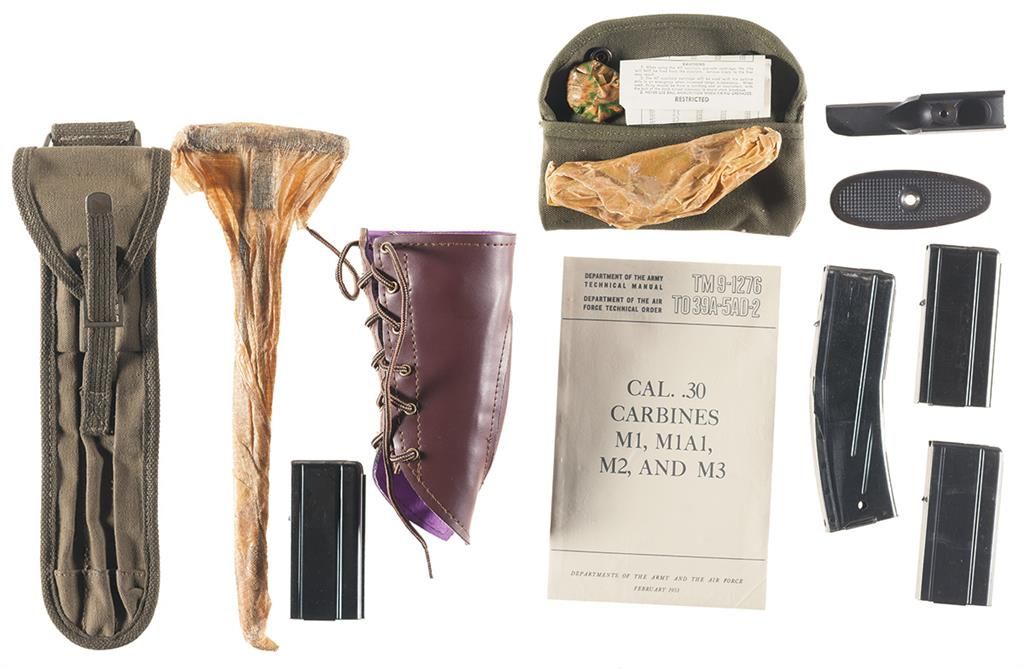 A) "SA 6 54" barrel, with a green canvas sling, bayonet with sheath, M15 grenade sight in pouch, cleaning rod, rubber buttpad, faux leather cheekpiece and a M1 Carbine manual (TM 9-1276).