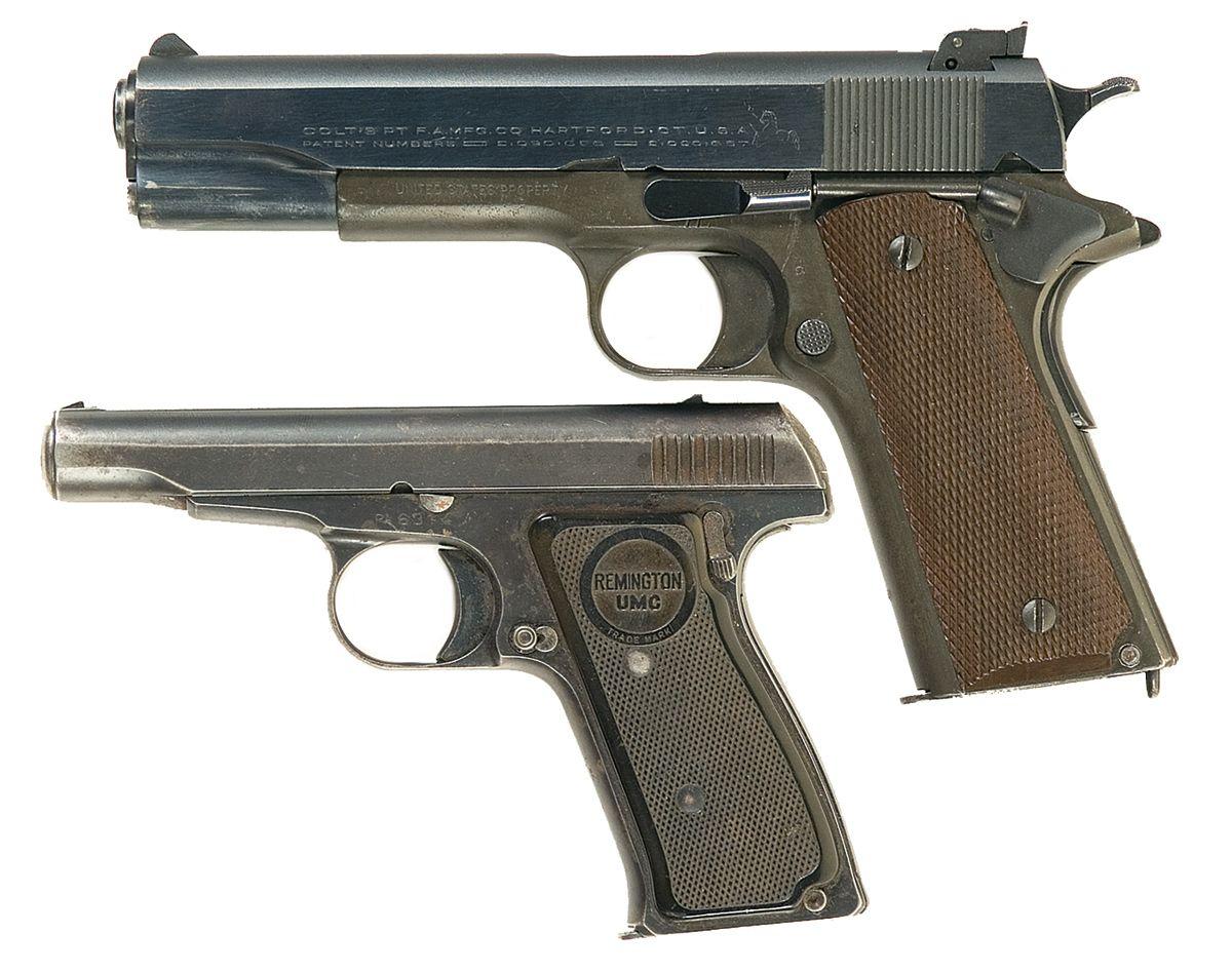 A) WWI frame, made in 1918. Fixed front and adjustable rear sights, with standard conversion unit markings. Augusta Arsenal rework stamp on frame. Keyes-Fiber grips.