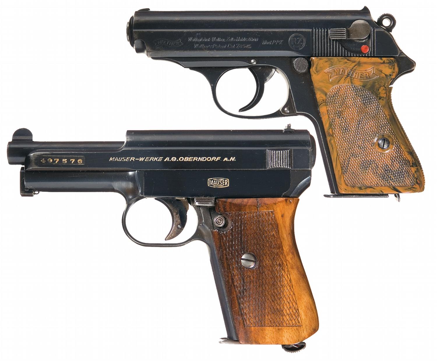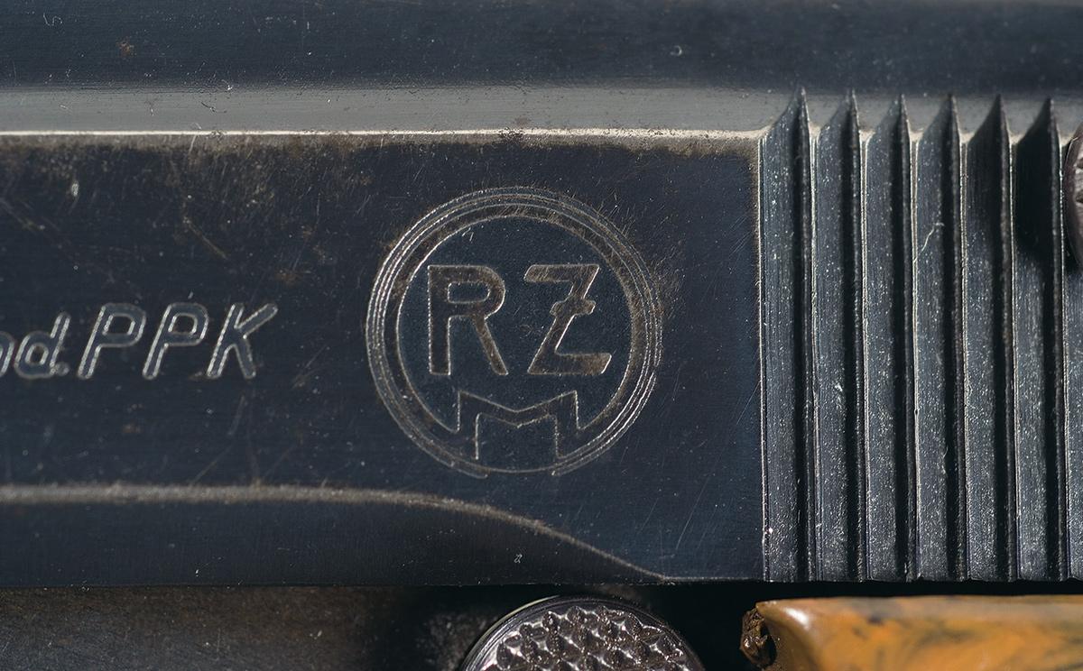 A) This is a nice example of a Walther Mod. PPK pistol with RZM marking on the left side of the slide between the factory logo and the serrations. The pistol has the high polish commercial blue finish and is fitted with one piece, brown plastic grips with checkered panels and the Walther Banner at the top. The slide has a cocking indicator pin and a 90 degree safety lever. The frame has a side magazine release and a lanyard loop on the butt with the serial number marked vertically on the right side. The magazine has a blue finish and is marked with the Walther banner on the lower left side. The left side of the slide is marked with the Walther Banner, the factory legend, and "MOD PPK" followed by RZM control mark. The "crown/N" commercial test proof is stamped on the right side of the slide below the ejection port and on the right side chamber and muzzle of the barrel.