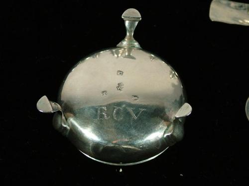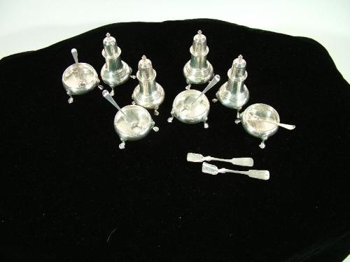 (England 19th Century) Two sets of sterling silver salt and pepper shakers, 4 3/4" by 2 1/2"; Set of 4 individual silver salt dispensers with spoons, signed individually