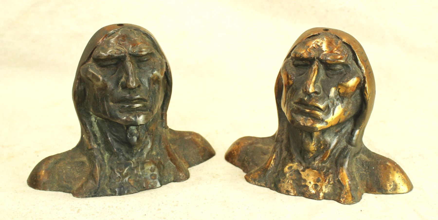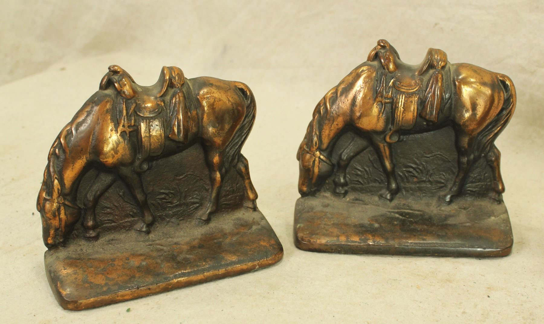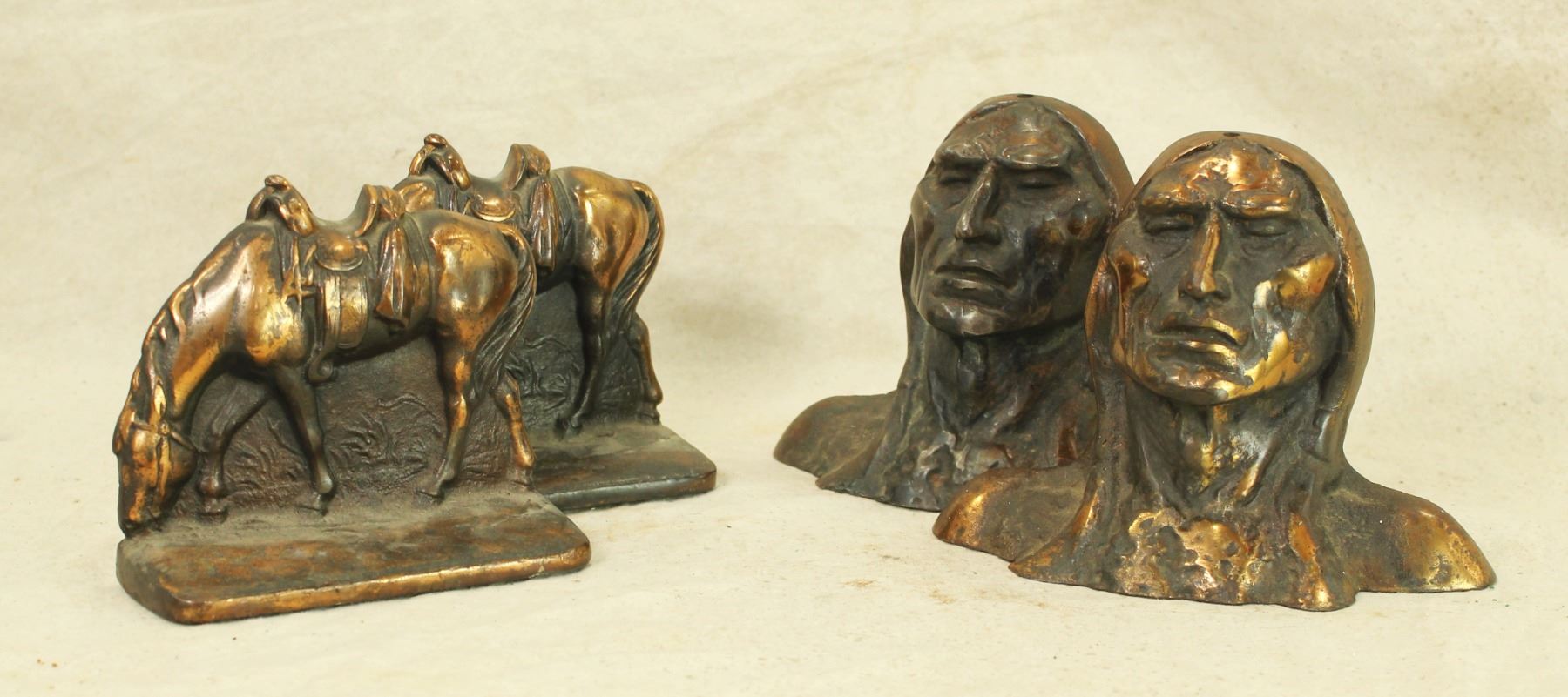 a grouping of two sets of copper flashed bookends, one being grazing horses and the other of Indian braves.