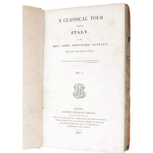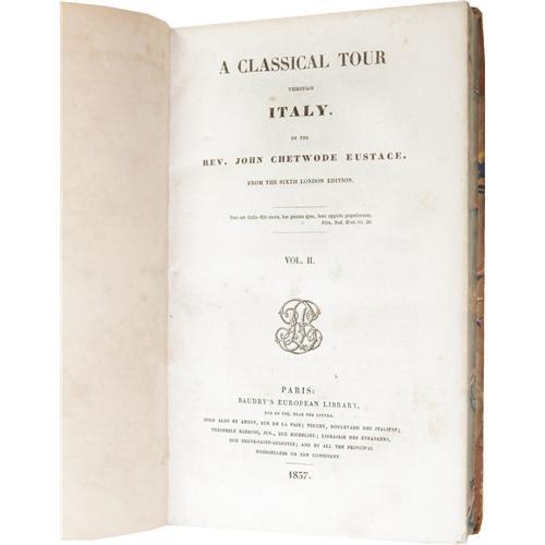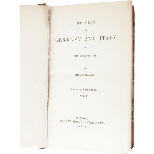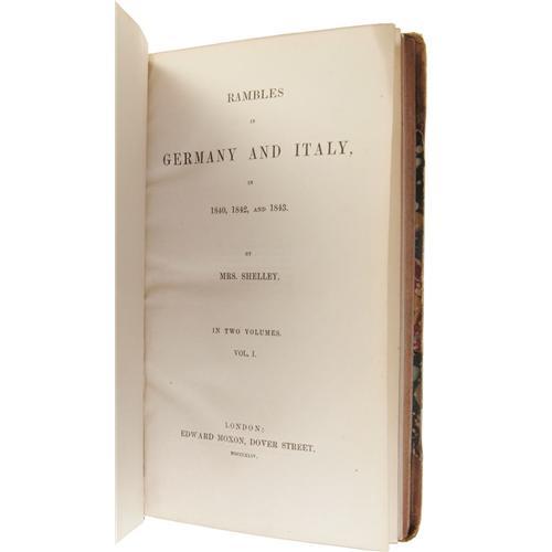 <B>Two Shelley-Related Travel Book Sets.</B></I> Mary Shelley: <I>Rambles in Germany and Italy in 1840, 1842, and 1843.</B></I> (London: Edward Moxon, 1844), two volumes, Volume I: 280 pages, Volume II: 296 pages, banded half-leather binding with marbled boards, 8vo (4.75" x 8"), no dust jacket (as issued). <I>Rambles in Germany and Italy</B></I> was Mary Shelley's last full-length work. It is based on letters written during two journeys she made with Percy Florence and several of his friends in 1840 and 1842-1843. Like her first book, <I>History of a Six Weeks' Tour,</B></I> <I>Rambles</B></I> is more than a simple travel memoir. It blends Romantic values, female emancipation and political advocacy, and includes Mary's narrative comments on war, national manners, historical perspectives, and political observations. The volumes are generally good, with a .375" piece missing from tail of spine, a .625" x 1.25" piece missing from the back upper corner, and rubbed boards. This set has been repaired.<BR><BR> Reverend John Chetwode Eustace: <I>A Classical Tour through Italy.</B></I> (Paris: Baudry's European Library, 1837), sixth edition, two volumes, Volume I: 284 pages, Volume II: 469 pages w/index, banded half-leather binding with marbled boards, endpapers, and edges, 8vo (5.25" x 8.5"), no dust jacket (as issued). The books are very good, with general shelf wear, including rubbed boards and corners. A most attractive set of Shelley-related travel books. <I>From the Betty Bennett Collection.</B></I><BR><BR><b>Shipping:</b> Books & Catalogs (<a target="_blank" href="http://www.heritageauctions.com/common/shipping.php">view shipping information</a>)